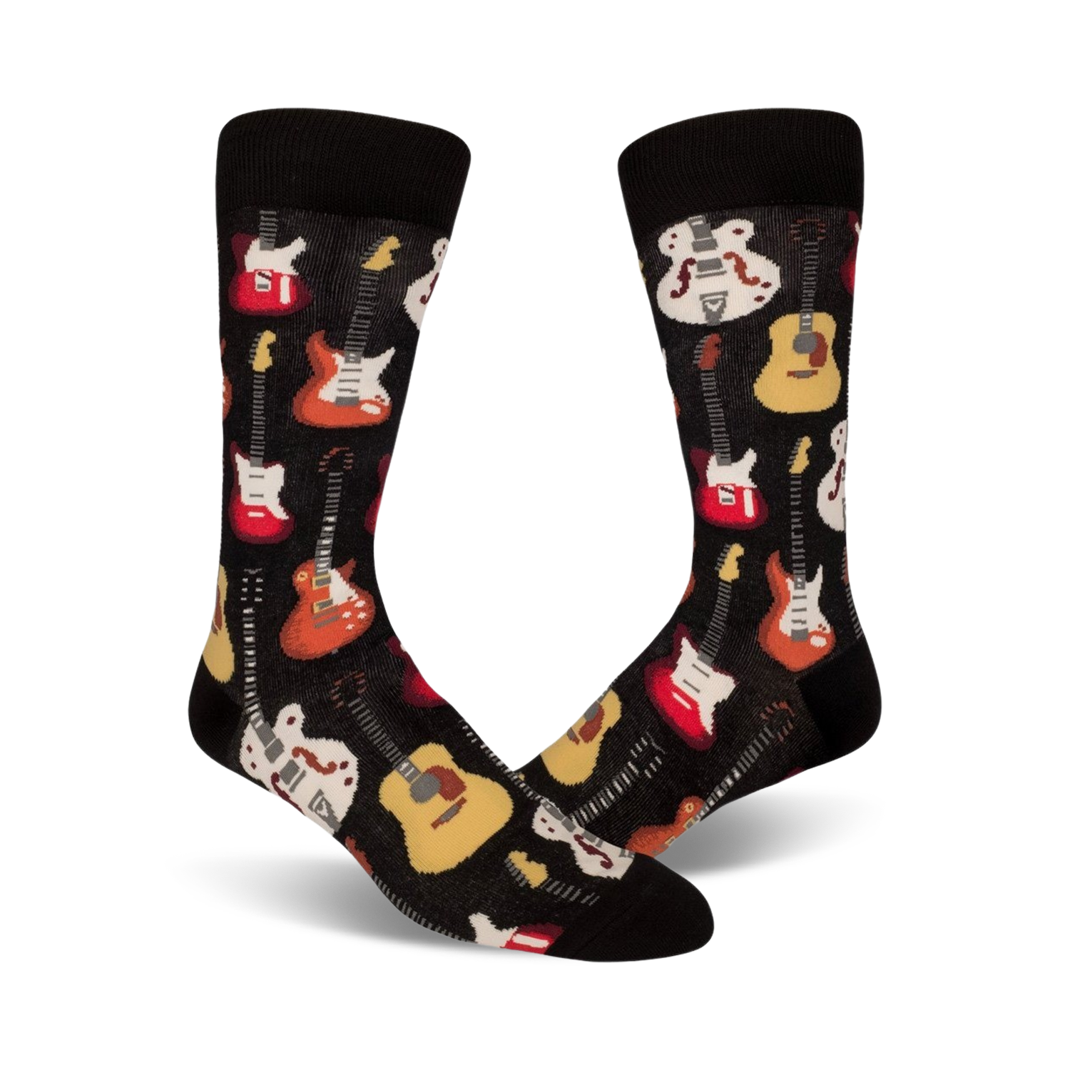 Music to your toes! These black crew socks for men feature a vibrant pattern of electric and acoustic guitars, perfect for any music lover. Rock out in style and show off your passion for all things musical. Whether you're a guitar player, a fan of live music, or just love to listen to your favorite tunes, these socks will have you feeling like a rockstar.
