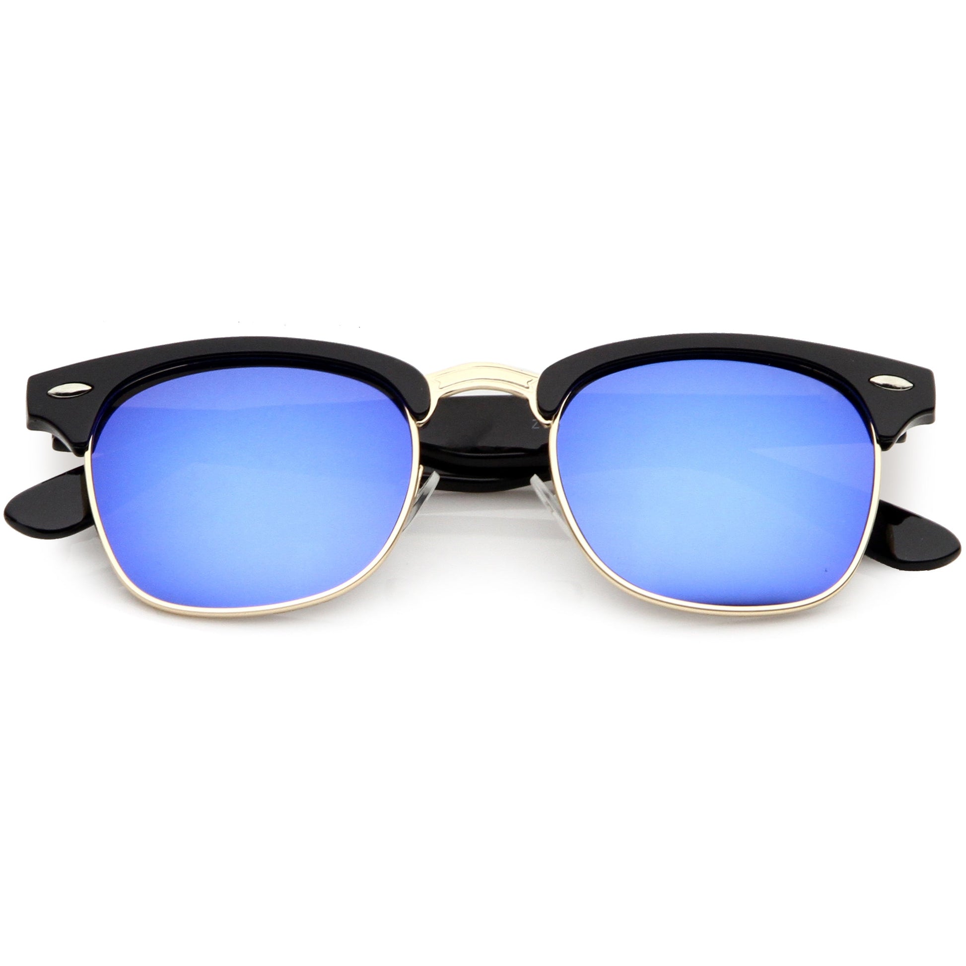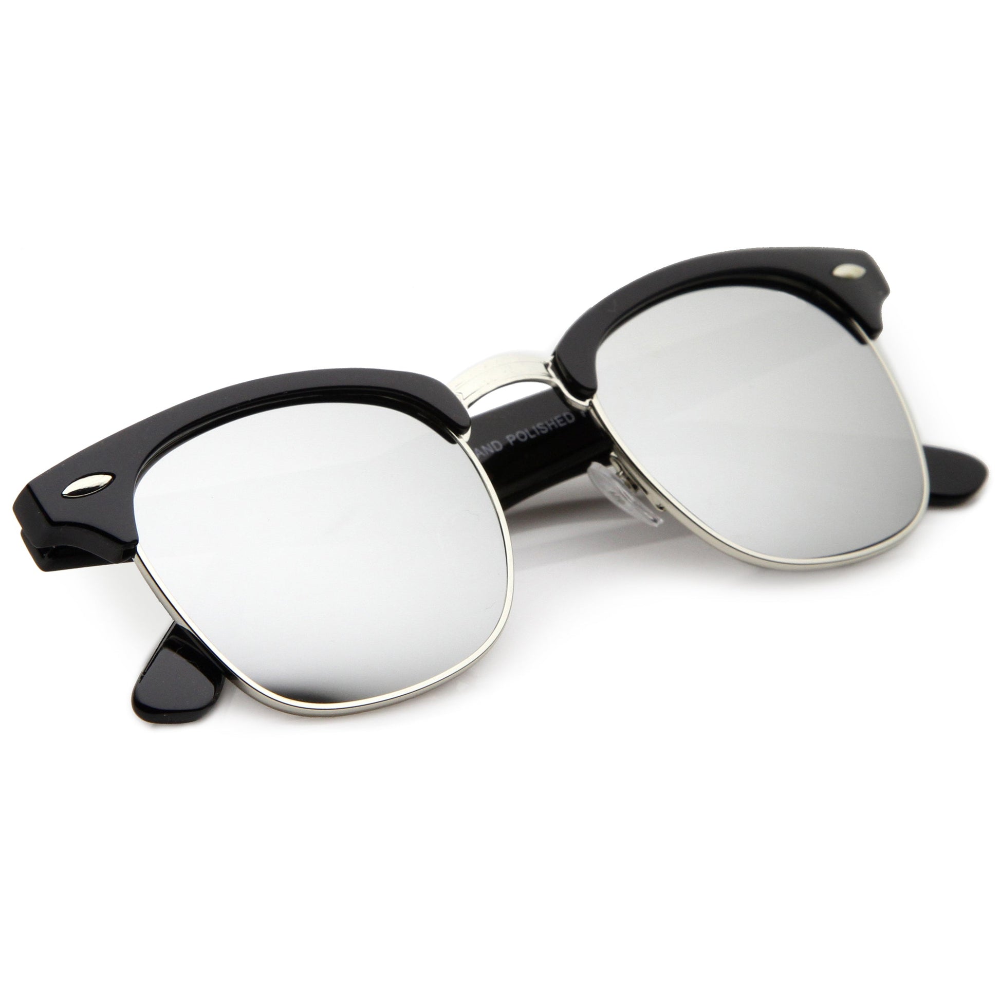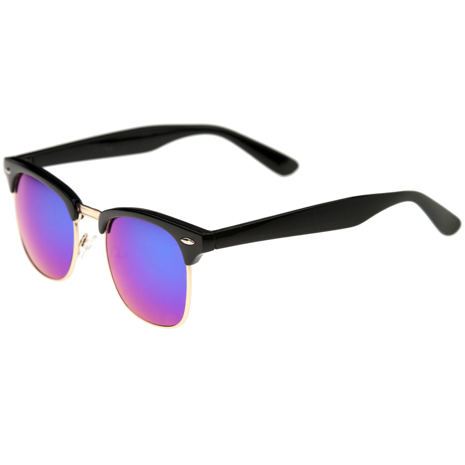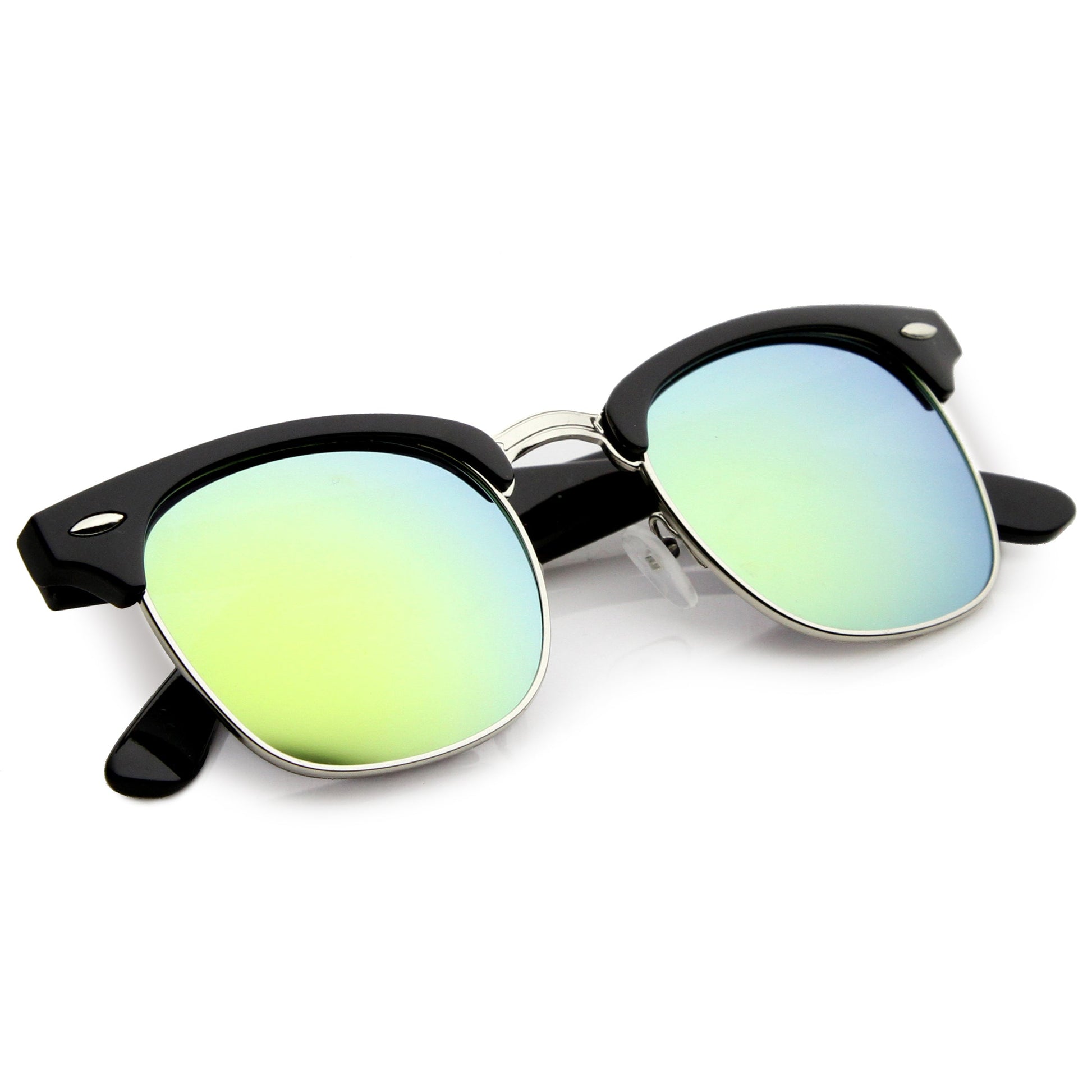 - A classic frame with a bold effect, these semi rimless sunglasses are designed with a subtle horn rimmed frame and stylishly wide arms. Stunning square colored mirror lenses add a pop of color, while the metal trim add a sleek touch. This style is great for summer by the water or exploring the city. Made with a plastic and metal based frame, adjustable English style nose pieces, reinforced metal hinges, and 100% UV protected lenses.