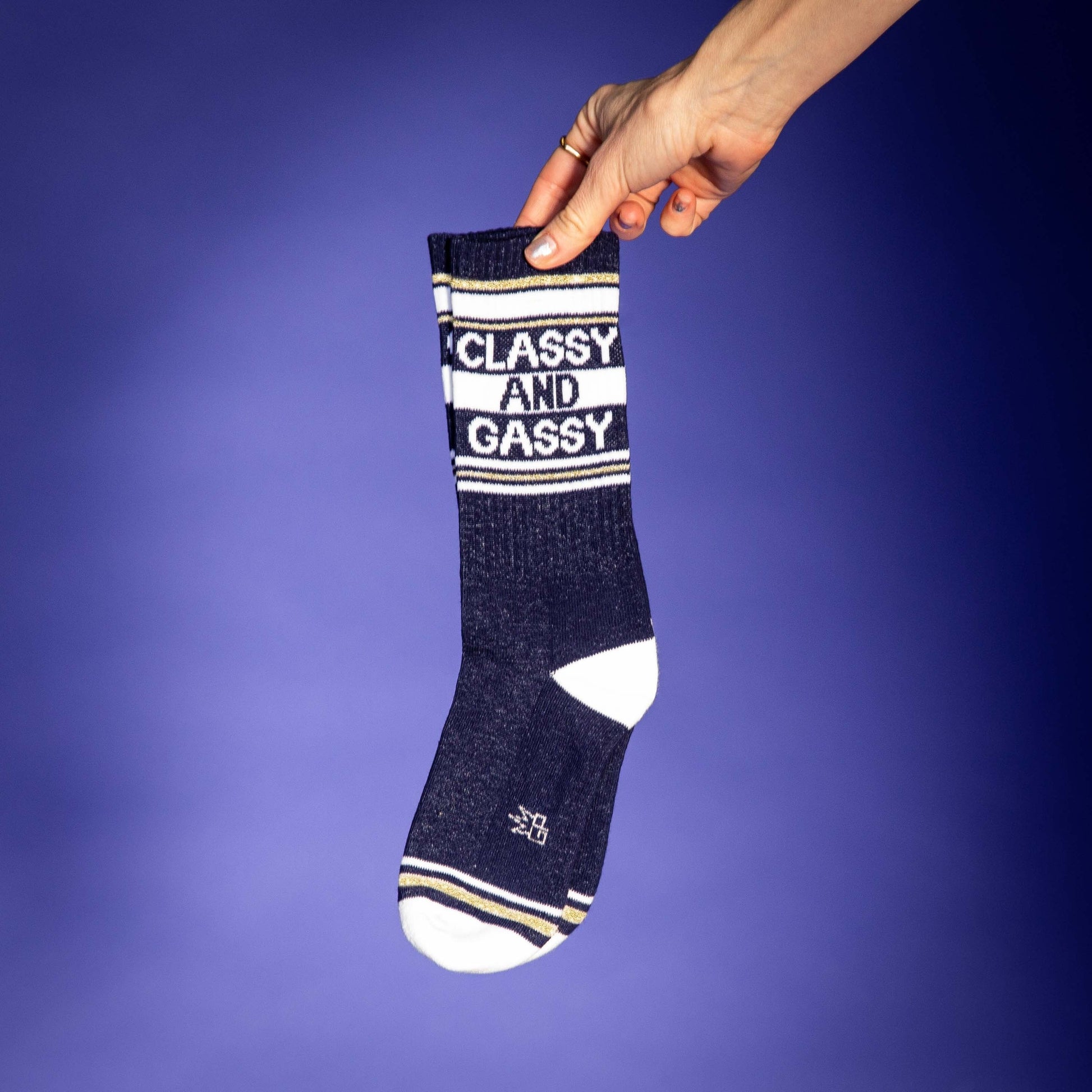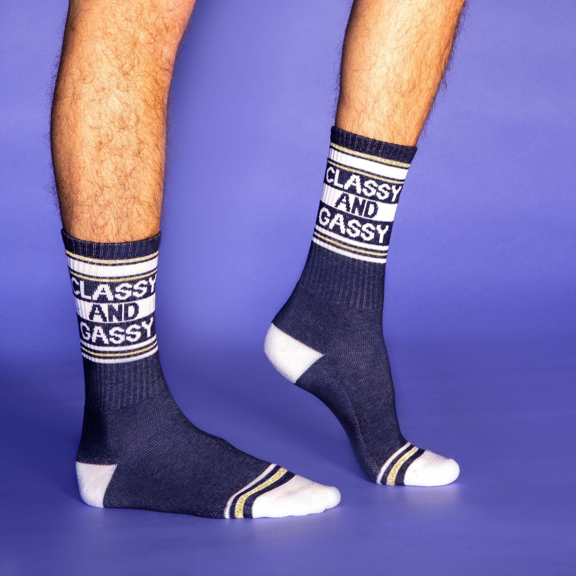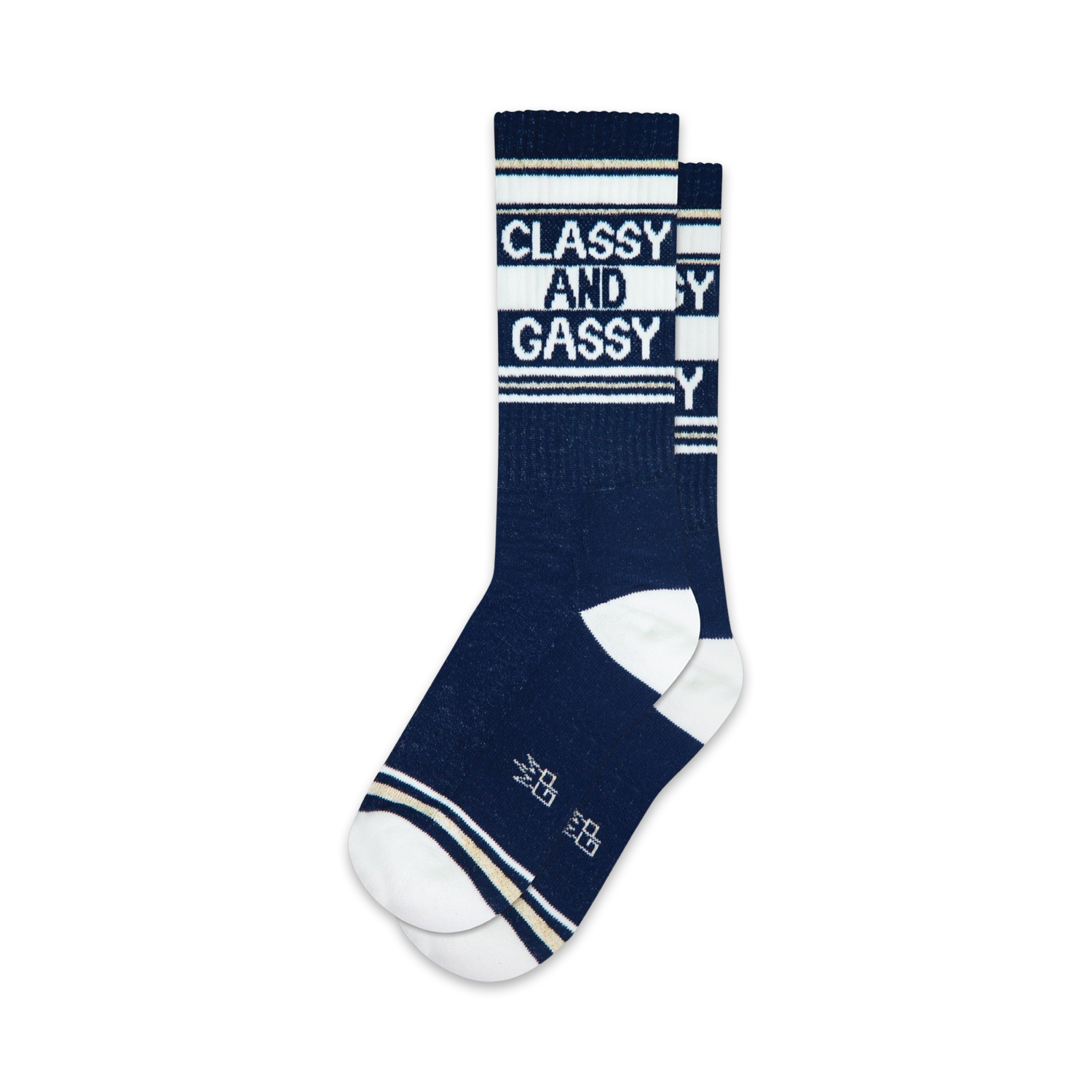 Classy and Gassy: Socks that make a statement. Wear these XL crew socks and let 'em know you're classy, and let's face it... gassy. It's not your fault, farts are funny! When ya gotta go ya gotta go, so get a rise out of your friends and spread some laughter with these soft and durable socks.