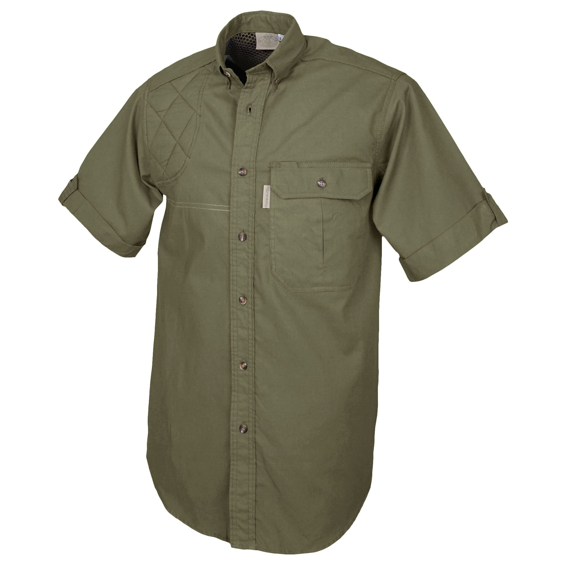 Clay Bird Shirt for men in short sleeves is a rugged safari shirt specifically designed to compliment a day of competitive trap shooting at the range. The mesh lined vent back circulates air to keep you cool. The quilted shooter patch is sewn on the inside of the shirt to cushion recoil and keep your gun from getting hung up. An FITASC competition shooter's line is sewn at regulation level to mark rested gun position. A single chest pocket with button down flap carries essential hunting gear. Button down collars stop collar points from hitting your face when firing on windy days. Made in Africa from pre-washed and pigment dyed 100% cotton for easy care and a natural worn look. This mens short sleeved clay bird shirt will round out an afternoon of skeet shooting with friends at the local gun club.