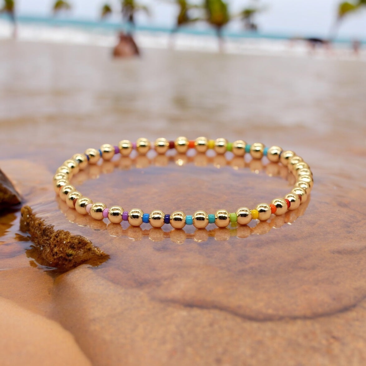 This delicate bracelet is made from 18k gold-plated beads, which are imported from Japan. The golden ball beads are 3mm in size. It fits comfortably up to an XL size. You can expect to wear and live in this bracelet without needing to replace it because of its high quality.