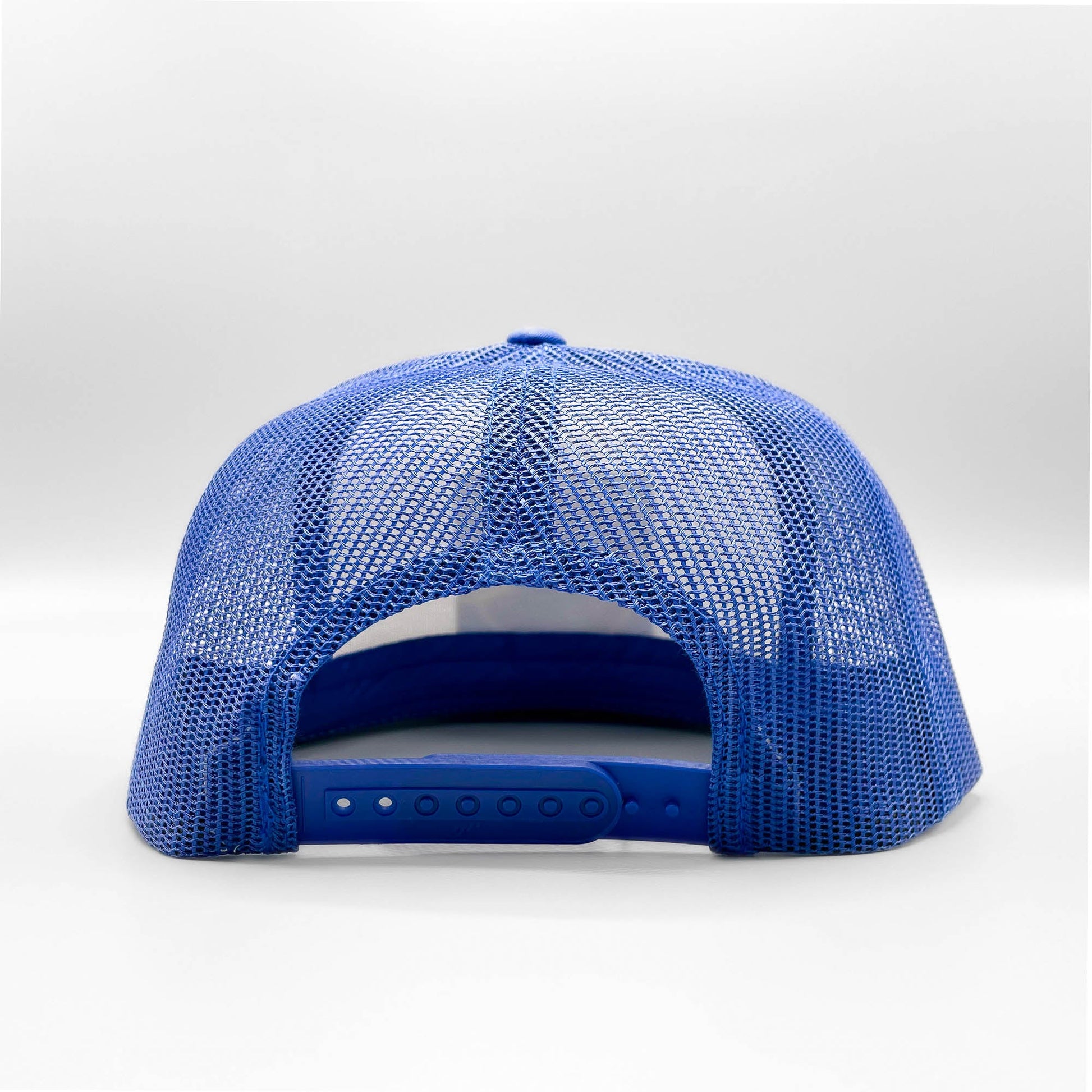 - - Classic all white with royal blue trucker hat with premium, royal blue mesh panels