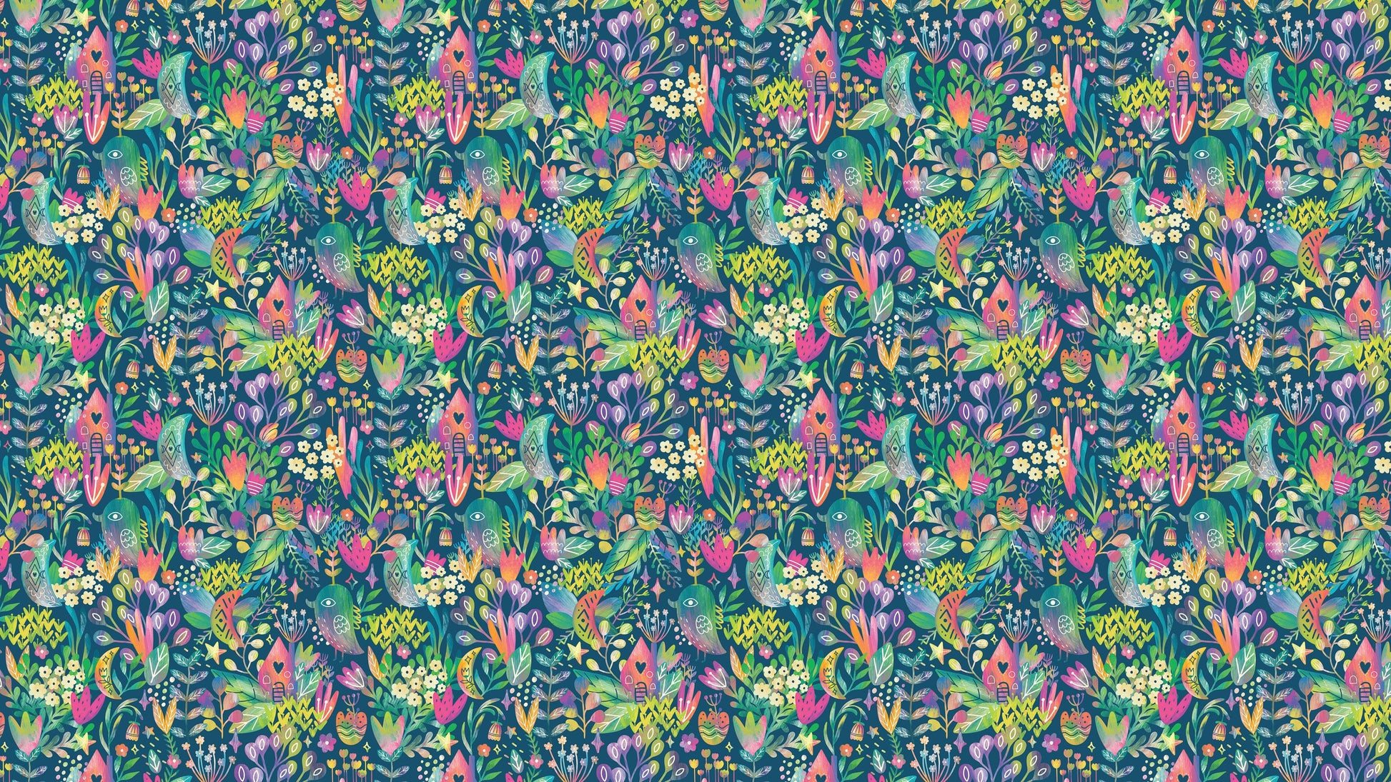 Colorful Flower Garden with Bird House Illustration Wall Mural. #6444