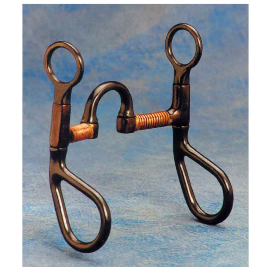 This is a moderate leverage correction bit. 6" black steel cheeks. 5" copper wire wrap with 3-Piece correction mouth. Good for colts that are running through a snaffle mouth bit.