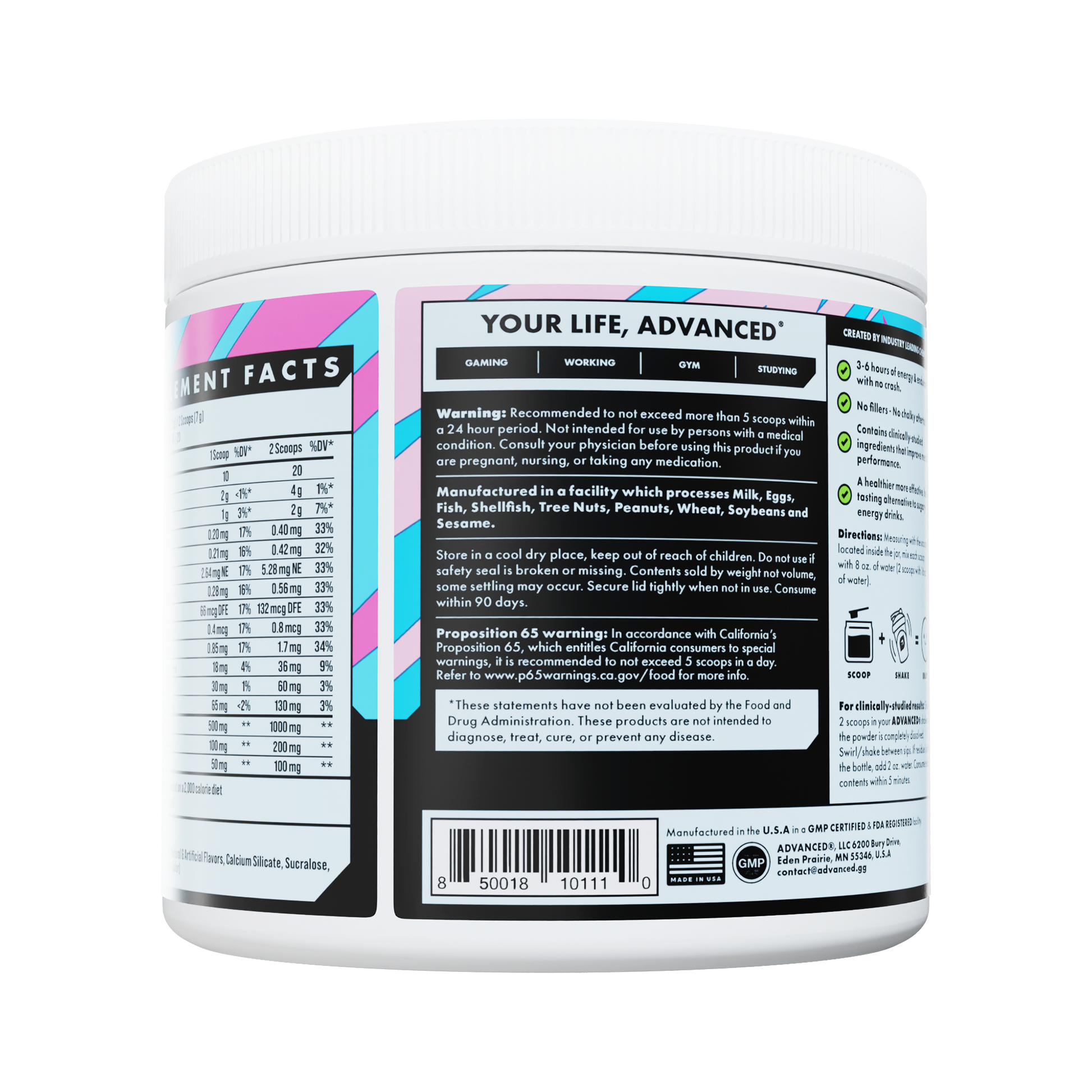 Looking for an energy supplement to help you dominate your gaming sessions, power through the workday, or crush it at the gym? Then ADVANCED ENERGY is what you’re looking for.