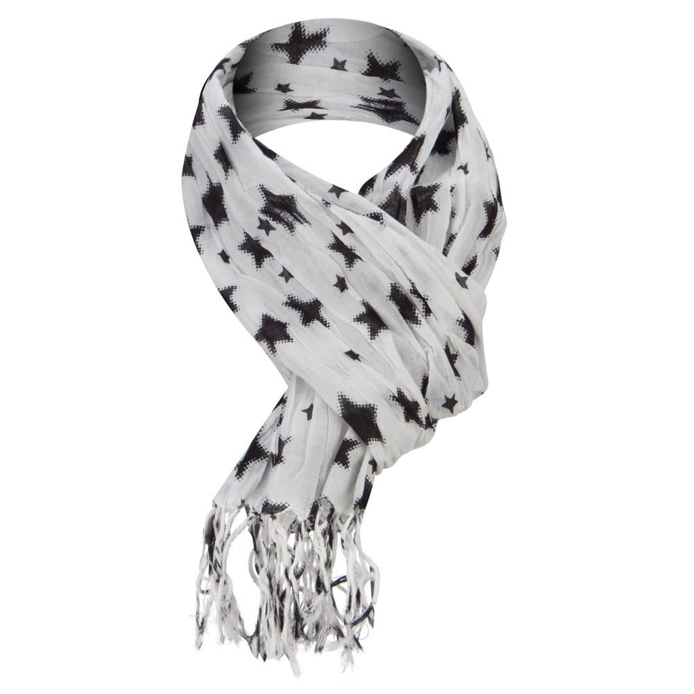 Unique Design, Scarf with stars in white. Fringes accented at the ends.