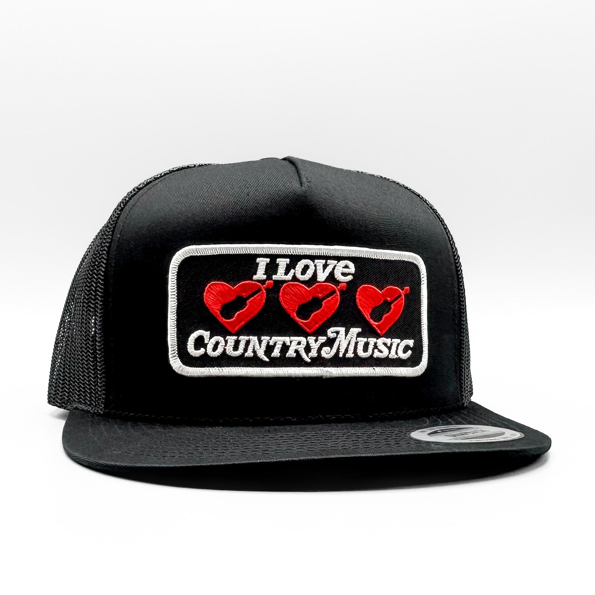 This retro Country Music Fan trucker hat features red and white embroidered patch on an all black, premium Yupoong 6006 Classic high-crown mesh snapback baseball cap. If your favorite kind of music is from the heart of Nashville, ths is the trucker hat for you.