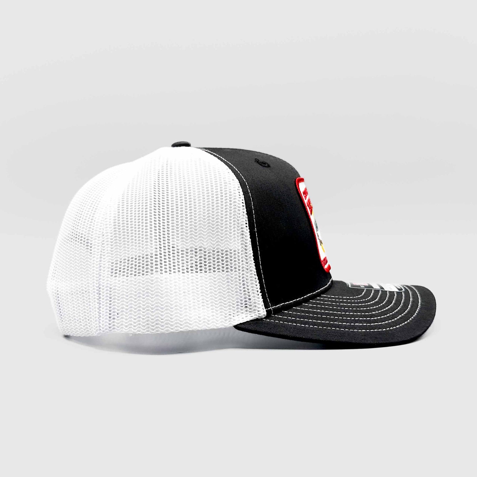 This trucker hat features a Cousin Eddie's RV Sales & Service embroidered patch on a premium black and white mesh Richardson 112 mid-crown, mesh snapback trucker hat. This is the Richardson 112 version of our Cousin Eddie's patch from the classic Chevy Chase movie, National Lampoon's Vacation and is the perfect gift for Chevy Chase Vacation movie fan.