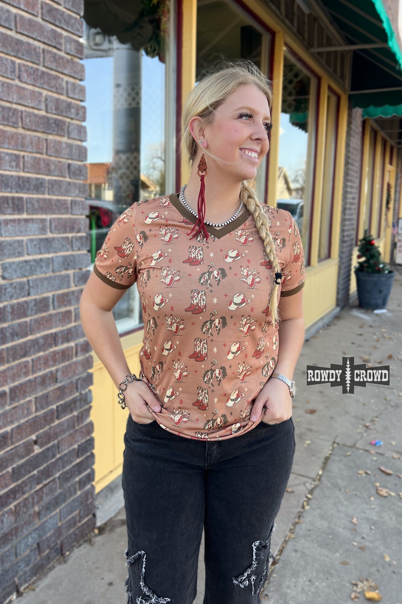 Step into the wild west with the Cowboy Killer Tee! The brown base features bold hats, boots, bucking broncs, and prickly pears, while the dark brown collar and sleeves add a touch of ruggedness. Take on any adventure with this daring and unique design.