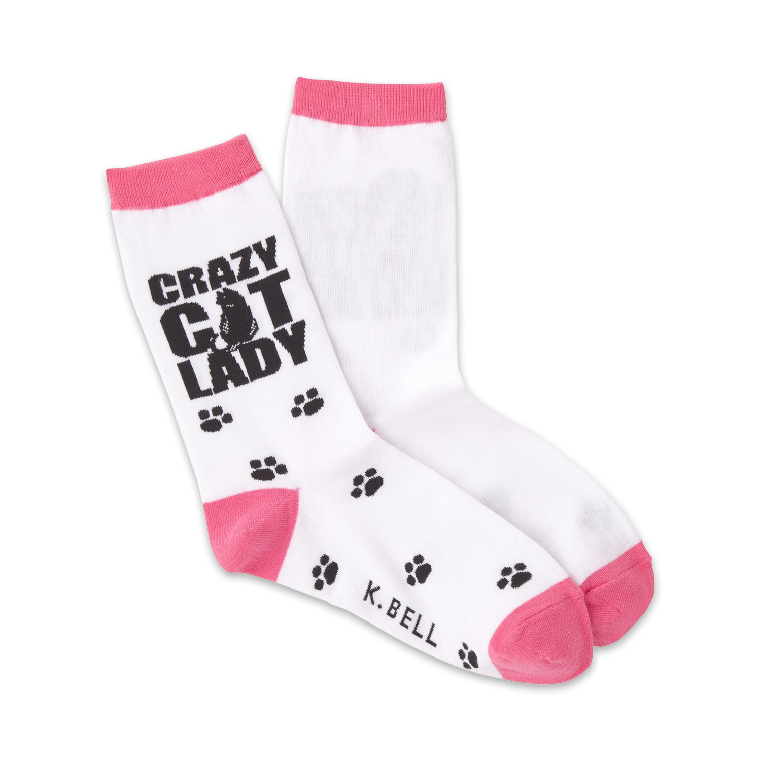 A house is not a home without the sound of pitter-pattering paws and purrs! If you are a crazy cat lady, you know every home needs a cat, or two… Or ten. Show off your furry feline insanity with these cute white and pink crew socks. Each pair features a black paw print pattern with the phrase "Crazy Cat Lady" on the sides of the ankle. These funny socks will keep your feet warm when there isn't a cat in sight to lay on them! Me-ow!