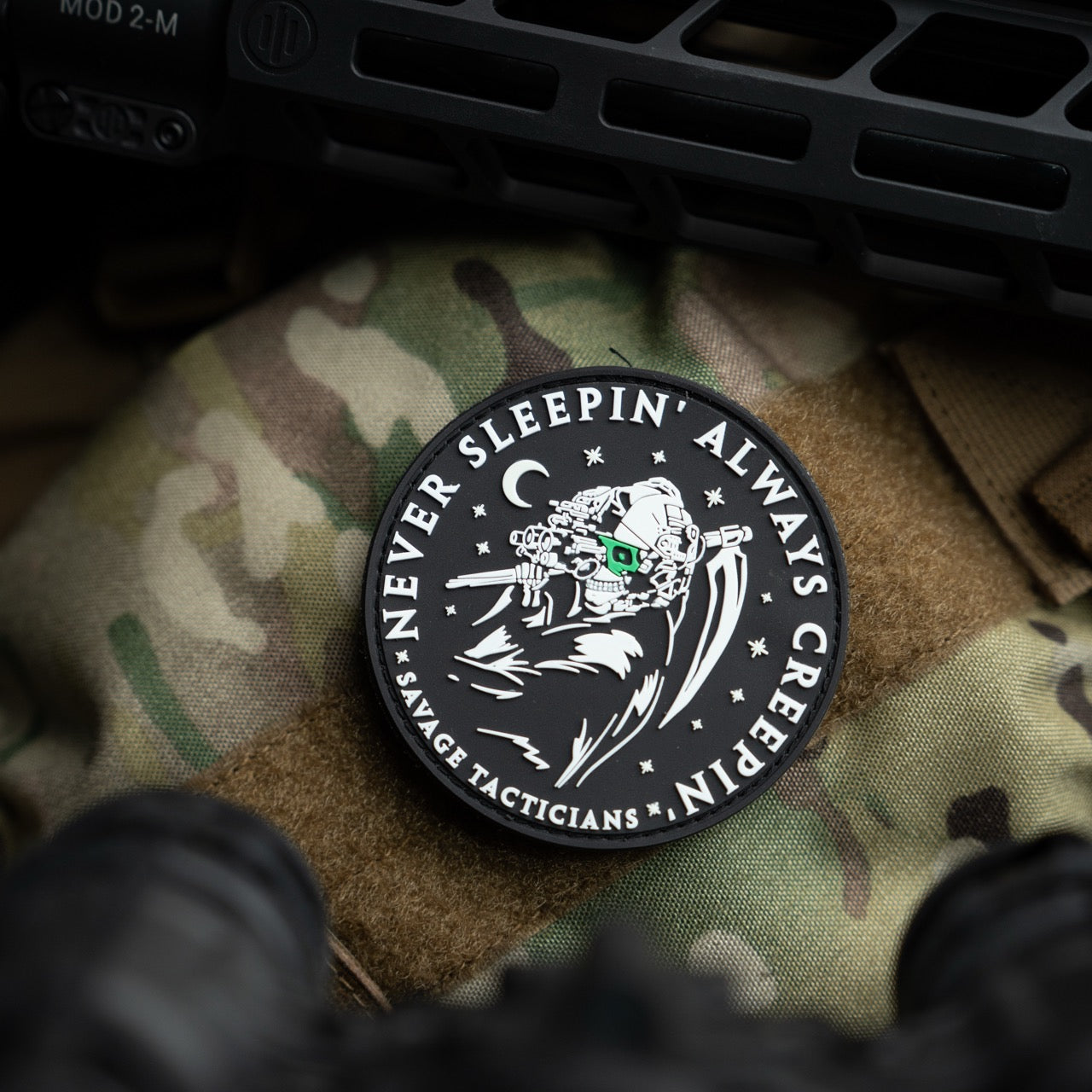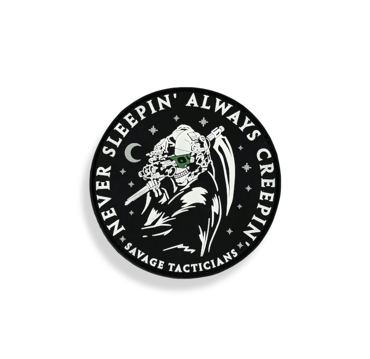 The Creepin' patch is a tough, heavy-duty PVC emblem built to endure the harshest conditions. Its round, 3-inch design makes a bold impact, and the molded hook and loop fastener backing allows for quick, secure attachment to most fabrics. Featuring a glow-in-the-dark element, this patch adds an extra layer of stealth and edge for those who move with precision under cover of darkness.