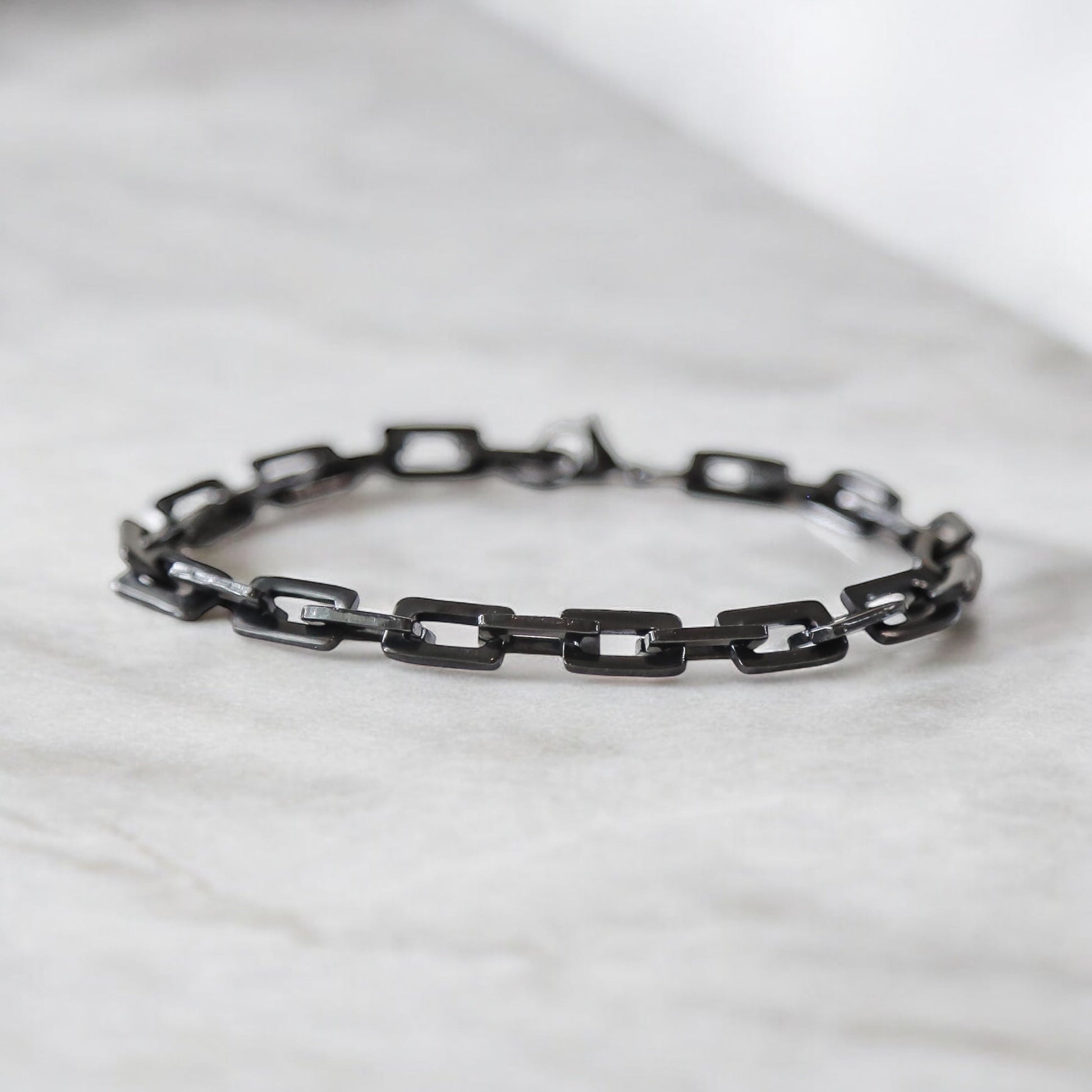 Made from steel, this handsome black chain bracelet accents any wrist. Durable, waterproof and classy, it's the perfect addition for any tough guy to wear. Fits up to an 8.5 inch wrist. Fits men sizes med-3X best.