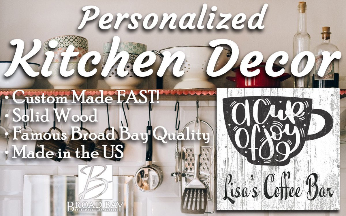 This unique, farmhouse-style customized coffee bar sign makes a great birthday, holiday, or anniversary gift. Perfect for kitchen, coffee bar, or home office decor. Broad Bay only uses solid wood for the highest quality home decor signs. Custom created daily in Virginia Beach, our signs feature our unique Fresco Print process that actually embeds your design into the surface of the solid wood coffee bar sign for a long lasting and vibrant appearance. Personalized fast, our customized coffee kitchen signs make the perfect gift for a man, woman, family or coffee loving couple!