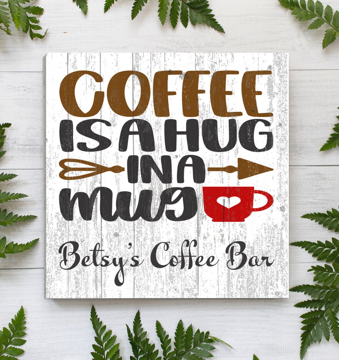 This unique, farmhouse-style customized coffee sign makes a great birthday, holiday, or anniversary gift. Perfect for kitchen, coffee bar, or home office decor. Broad Bay only uses solid wood for the highest quality home decor signs. Custom created daily in Virginia Beach, our signs feature our unique Fresco Print process that actually embeds your design into the surface of the solid wood sign for a long lasting and vibrant appearance. Personalized fast, our customized signs make the perfect gift for a man, woman, family or couple!