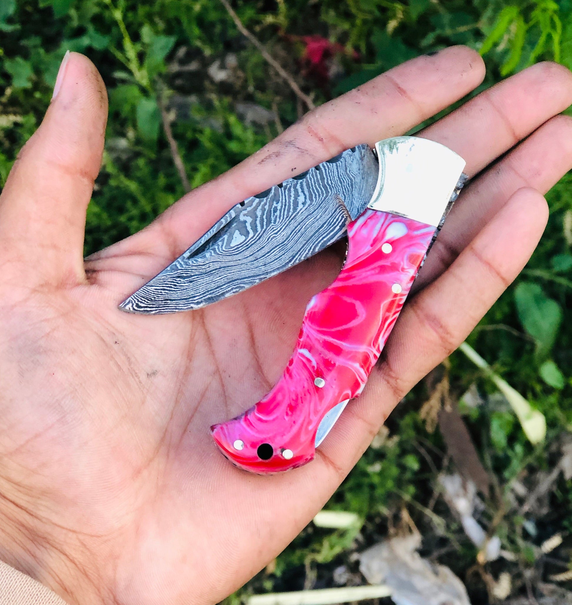 Custom Handmade Damascus Steel Top Best Folding Pocket Knife with Epoxy Resin Handle and Leather Case by KBS Knives Store.