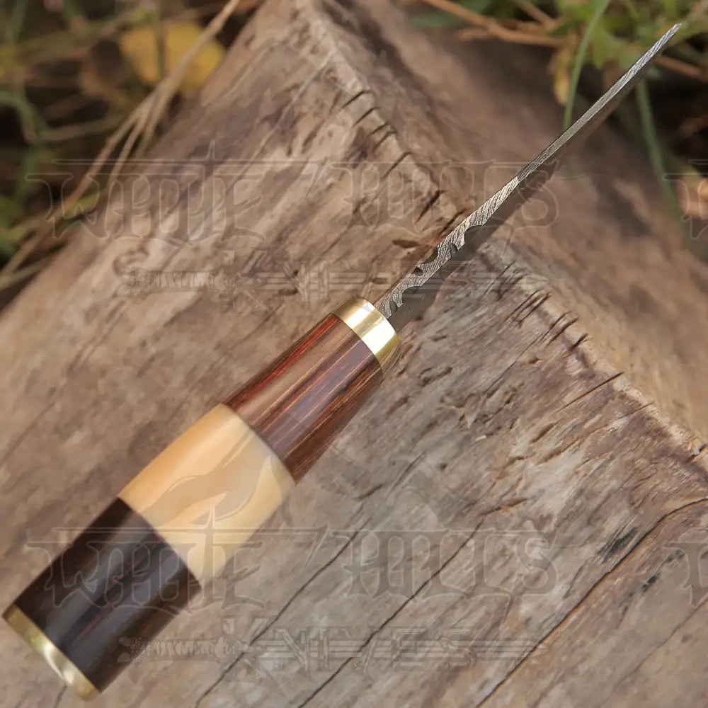 This superb design knife is hand forged. Blade of this knife has a nice file work and is made of 512 layers of stainless steel and high carbon steel with hardness 55-60 HRC. This robust knife is lab tested under intense conditions,; the balance and shape of this knife ensures perfect grip.