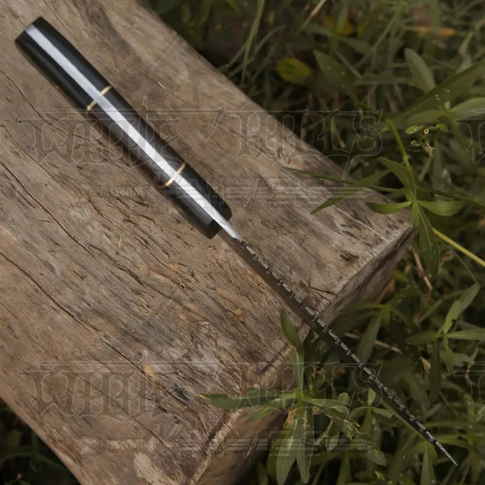 This superb design knife is hand forged. Blade of this knife has a nice file work and is made of 512 layers of stainless steel and high carbon steel with hardness 55-60 HRC . This robust knife is lab tested under intense conditions, the balance and shape of this knife ensures perfect grip.