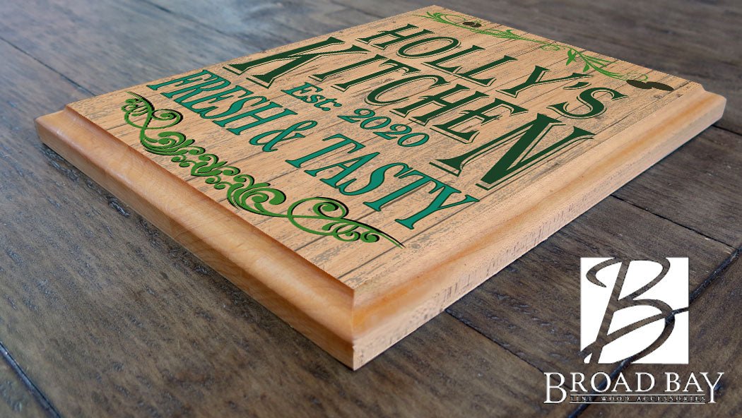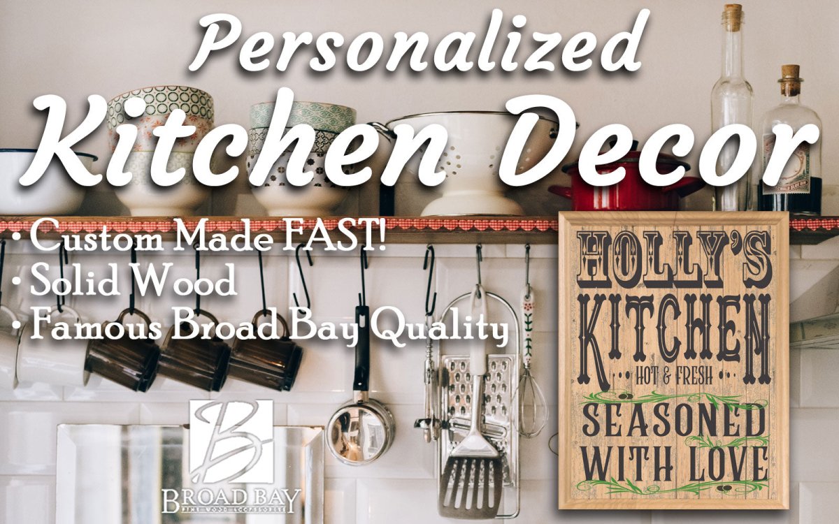 These personalized kitchen name signs are the perfect, custom kitchen gift ideas for a woman or man, any cook or chef! The unique kitchen name designs are personalized with a cook's name and/or an established date and printed on solid maple wood. Carefully crafted from solid maple wood, these unique, customized kitchen name hanging wood signs will be cherished for years to come and proudly displayed in any kitchen. The personalized kitchen designs are carefully applied to the maple wood with our VibrantPrint process: a unique method developed by Broad Bay, which allows the beauty of the solid maple wood to show through the artwork. No matter the style, these kitchen name signs are an ideal and top gift idea!
