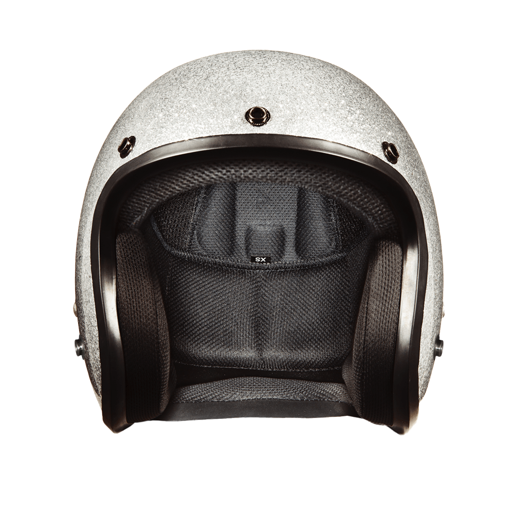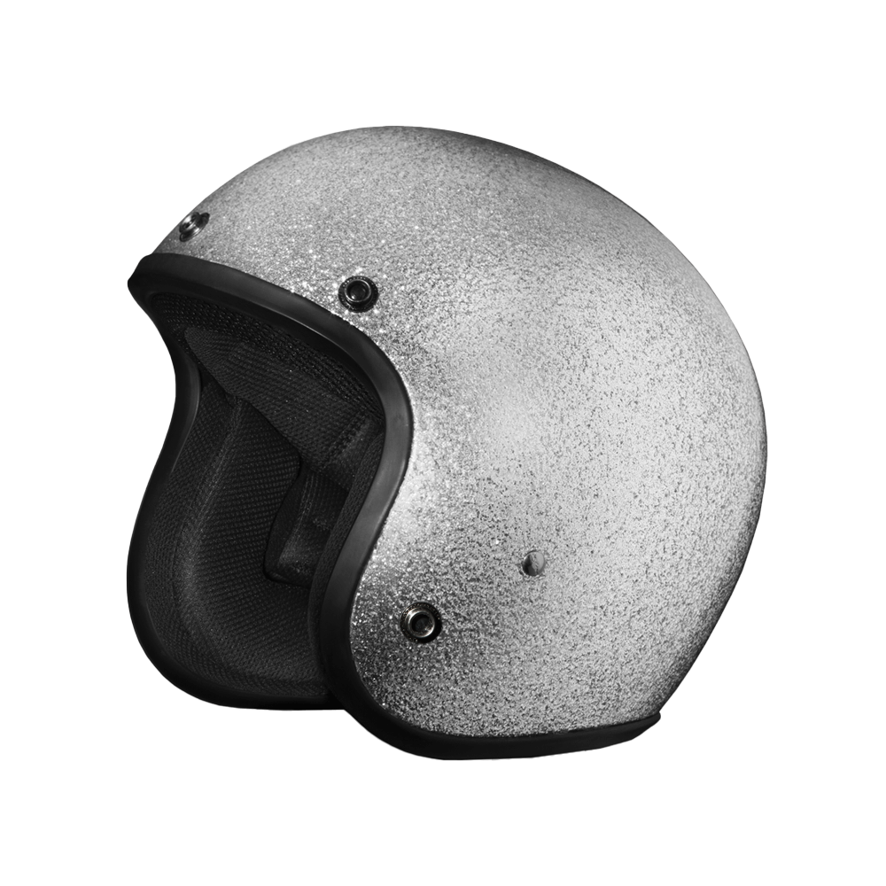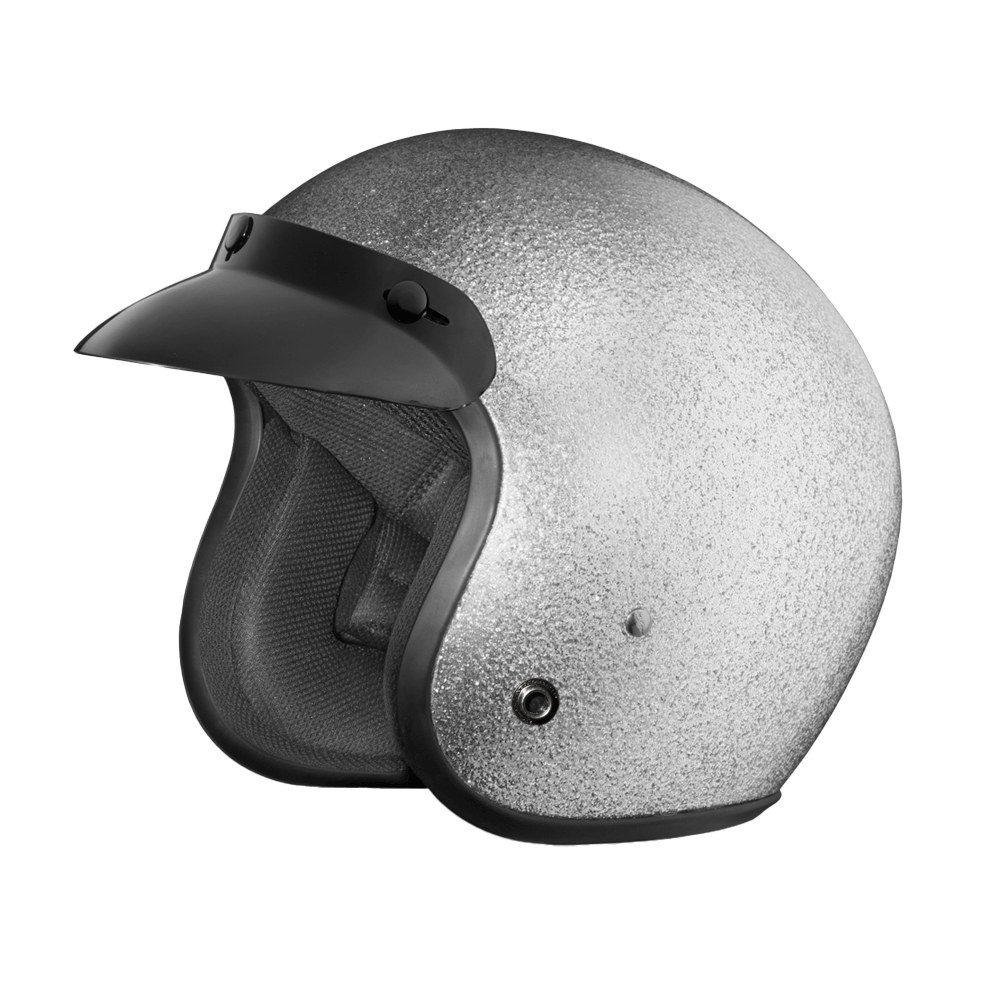 Our D.O.T. Daytona Cruiser 3/4 Shell Helmet In The Silver Metal Flake, Meets And Exceeds D.O.T. FMVSS 218 Standards And Is The Smallest D.O.T. 3/4 Shell Helmet Ever Made!!  With 3 Different Shell Sizes, You're Sure To Get That Proportionate Fit!!  Available Only With Removable, Snap On Gloss Black Bubble Visor.  Many More Colors And Designs Available Such As Soft Touch Dull Black, Hi-Gloss Black And Hi-Gloss White; Custom Colors: Gun Metal Grey Metallic; Specialty Items: Graphics.  Head Wrap And Cloth Draw String Bag Included.  Sizes Range From XS-2XL.
