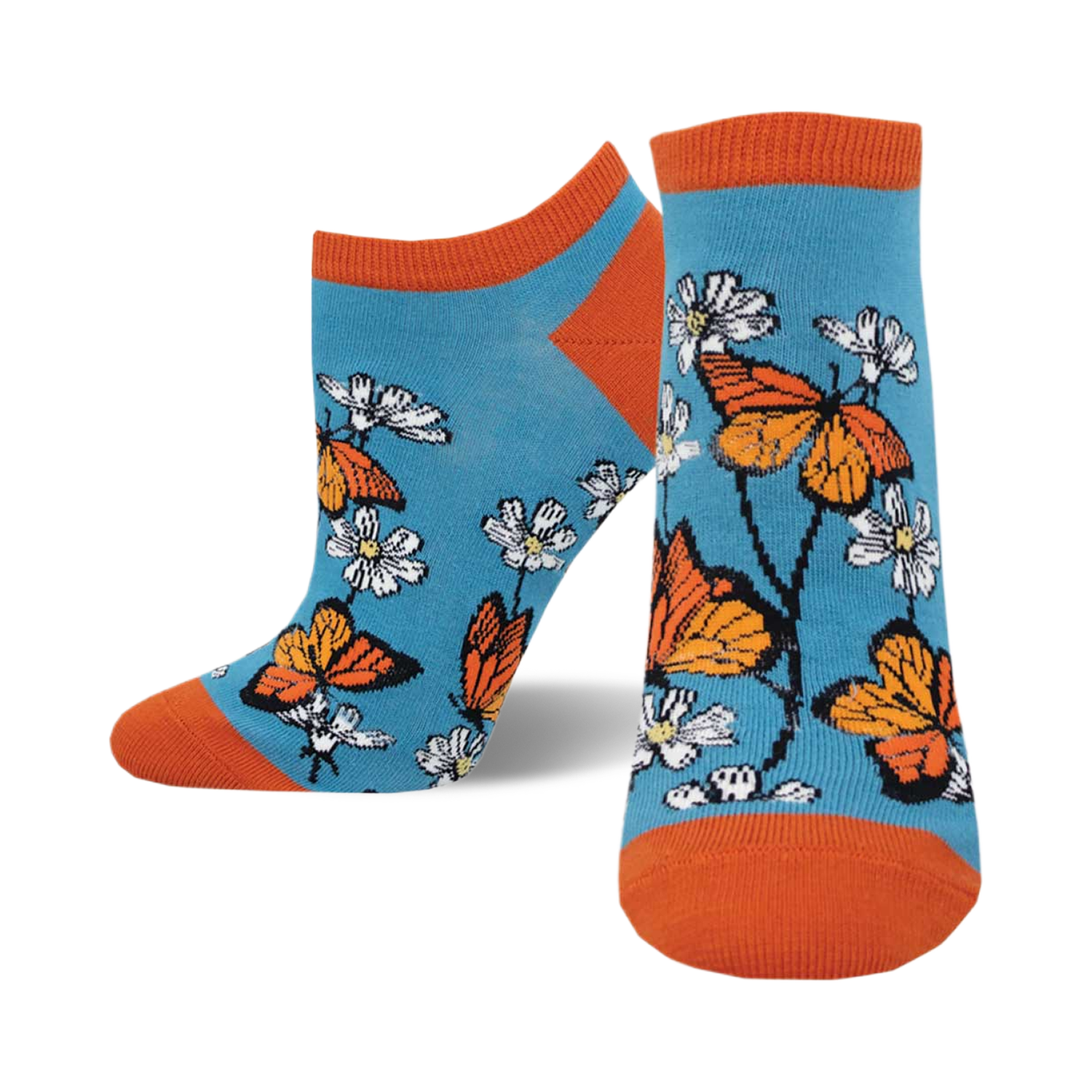 Float like a butterfly, stay grounded like a daisy. These women's ankle socks are a secret garden for your feet, blossoming with vibrant orange butterflies and a flurry of white and yellow daisies, all set against a tranquil blue backdrop. Dubbed 'Daisy Monarchy,' these socks don?ÇÖt just whisper spring?Çöthey sing it, with a touch of royal flair. Perfect for those who wear their nature vibes on their toes, not just their sleeves. Keep it cool, keep it floral, and let your feet do the talking.