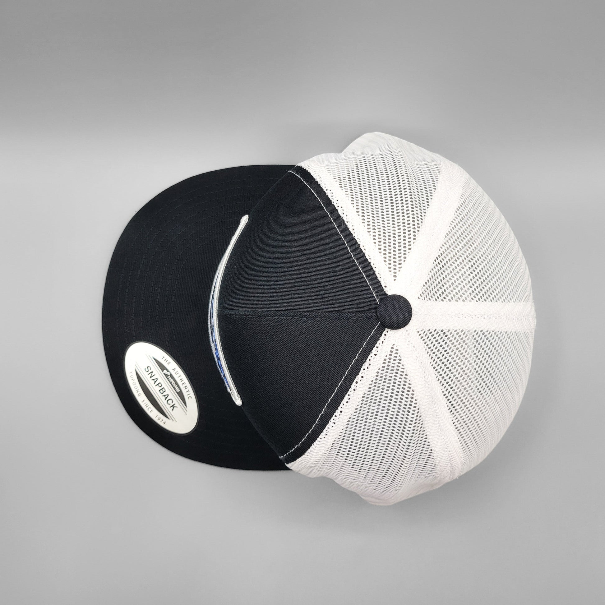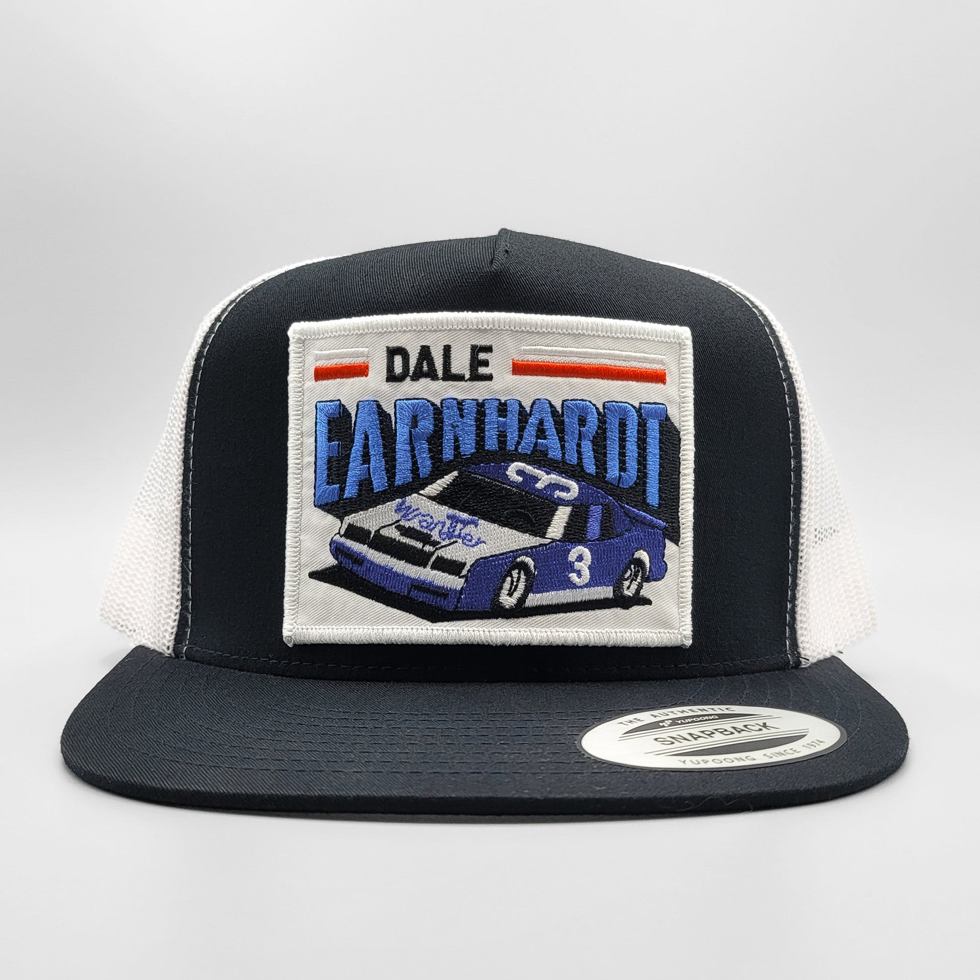 This listing is for a Dale Earnhardt #3 Wrangler Racing embroidered patch on one of our best selling (and best fitting) baseball style trucker hats -- a black and white mesh Yupoong 6006 Flat Bill Snapback Trucker Hat.