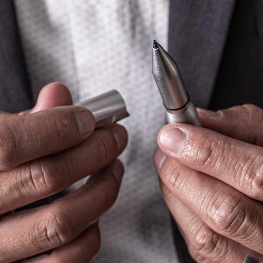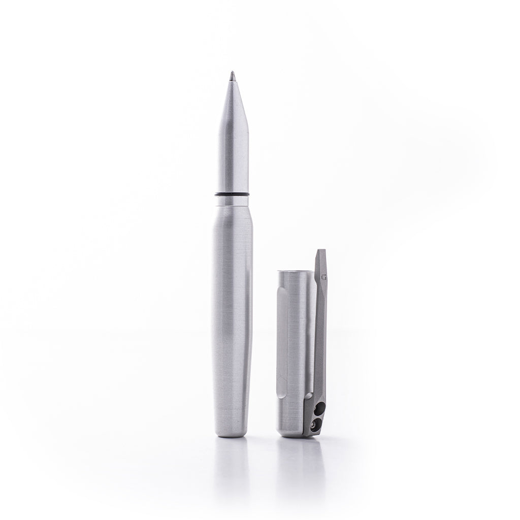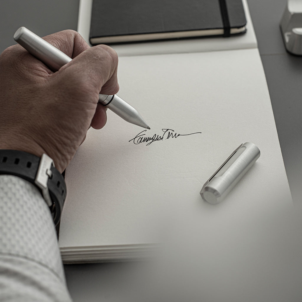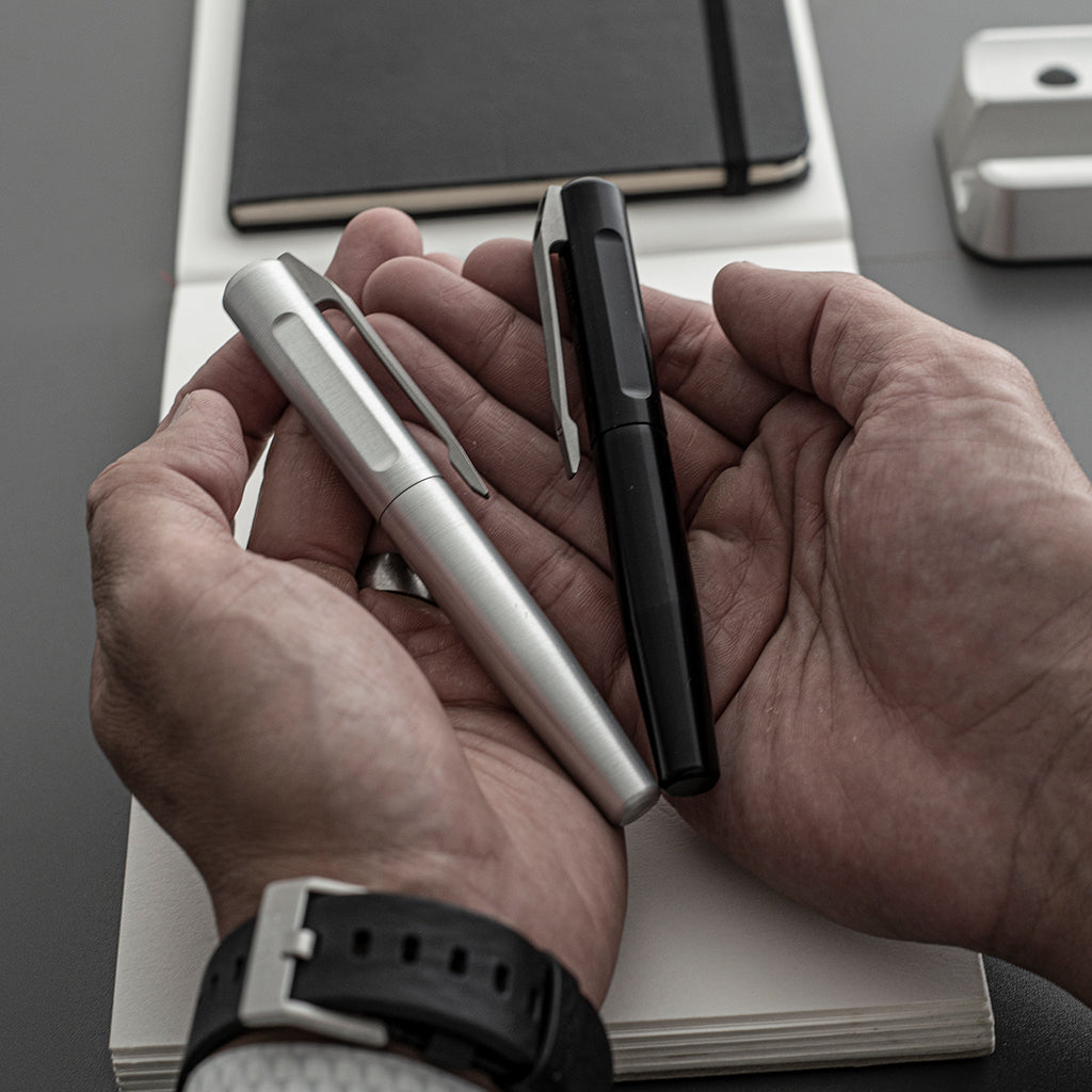 CNC machined out of 6061 aerospace aluminum and anodized in Jet Black or Satin Silver, this pen is equipped with a sleek stainless steel clip and a German Schmidt - safety ceramic roller, non-dry refill (5888 M). As comfortable it is holding the pen, this refill has an equally satisfying ink flow to the paper. The Dango Ace Pen is designed with a friction fit cap with a satisfying suction to seal the pen tip - no need to screw or unscrew. When in need, the cap can even be stored by connecting it on the end of the pen barrel to prevent misplacing the cap. Overall, the Dango Ace Pen flaunts a bold look and feel, and is surely a perfect fit for the person in the Ace's seat.