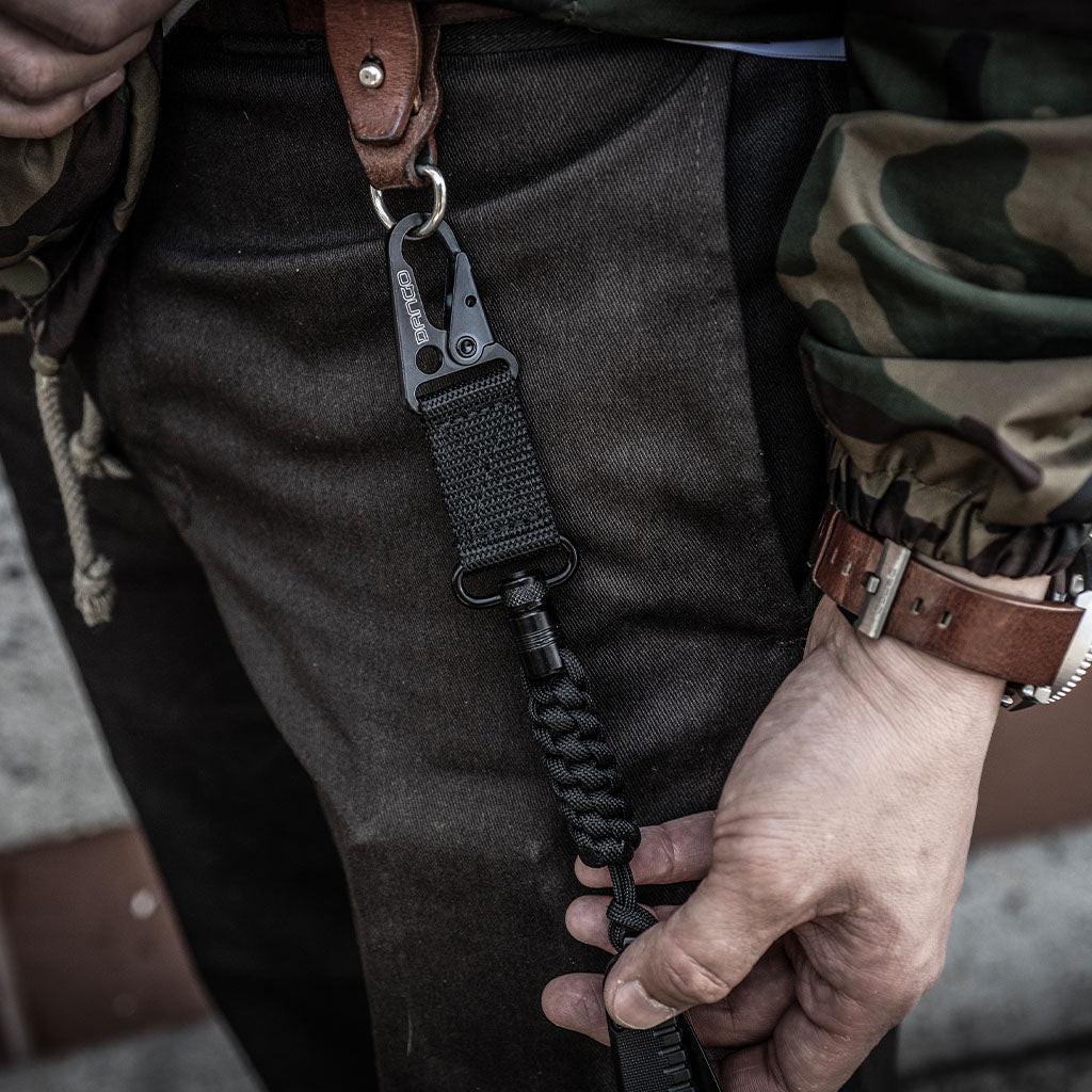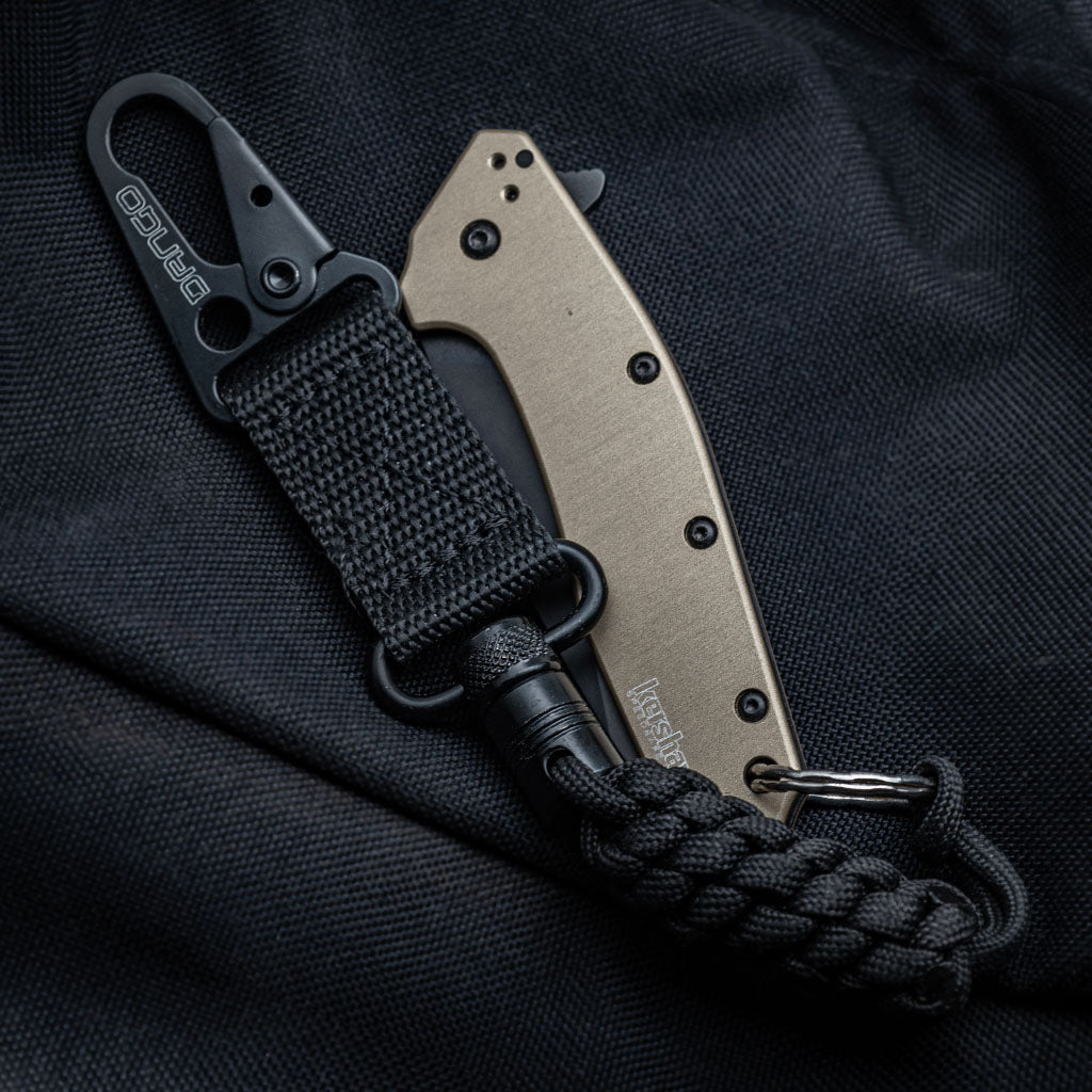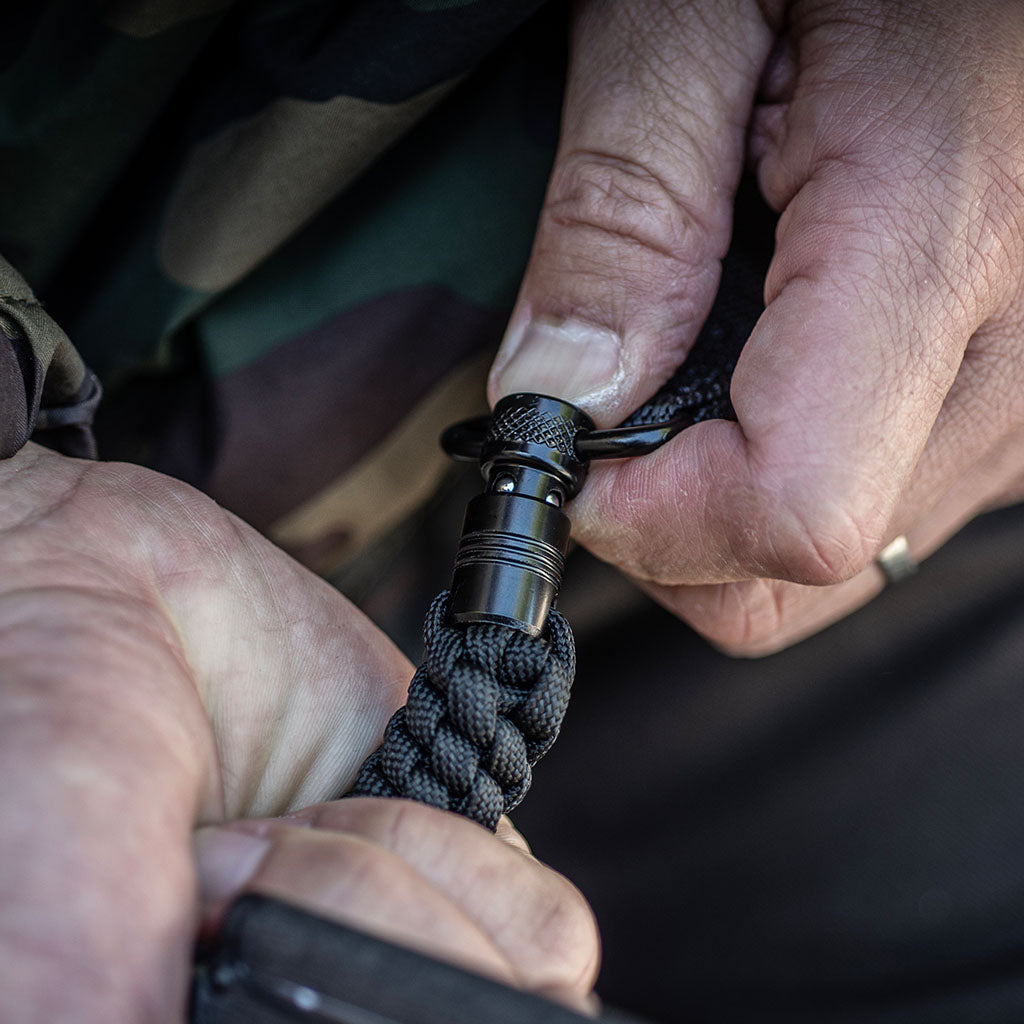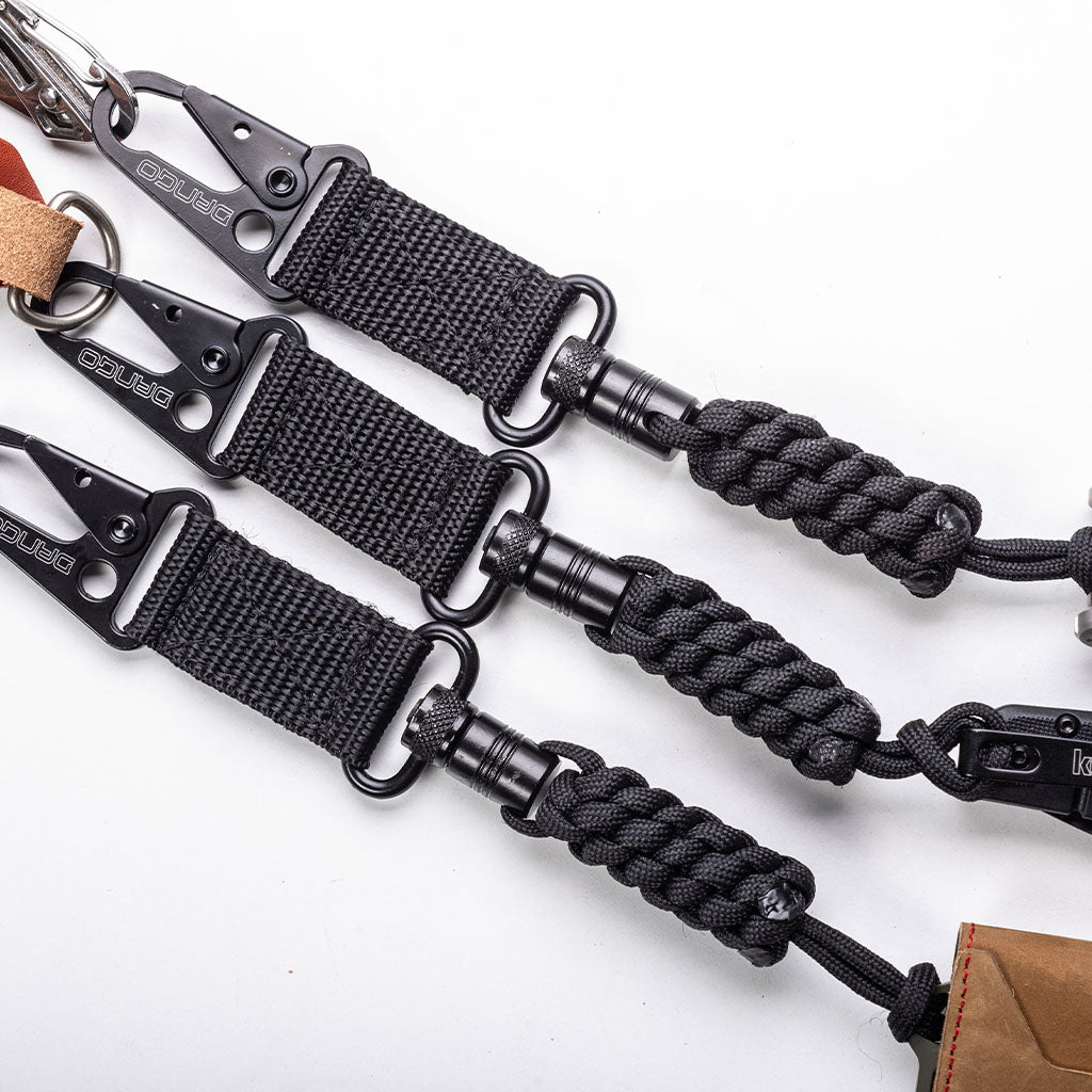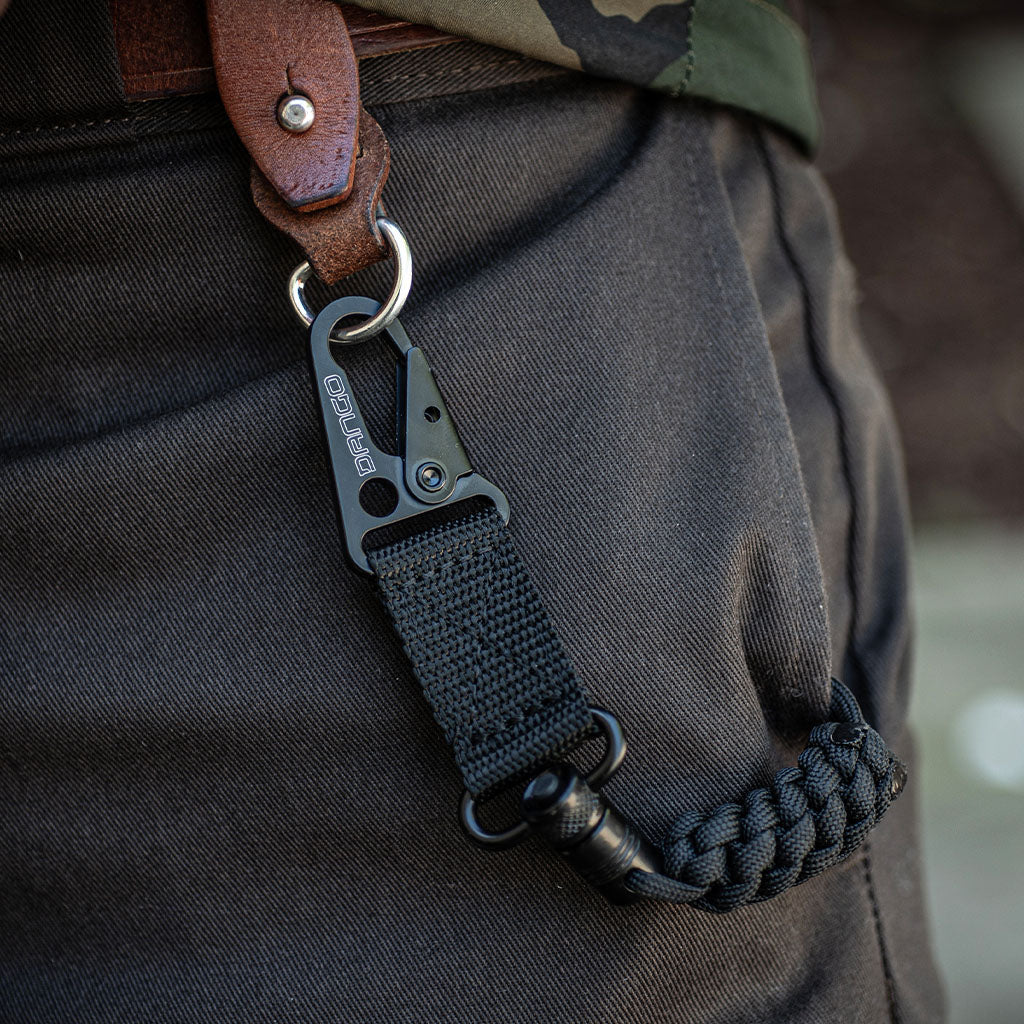 The real highlight of the Dango Quick Release Tether is its quick release ball bearing sling swivel, which allows you to detach your gear with a simple push of a button. When you need to access your tools, the tether can be quickly released, providing fast, one-handed operation for ultimate convenience. Once released, the paracord lanyard can unravel, expanding from a compact 3 inches to 3.5 feet of cord—perfect for a variety of situations that require additional length or flexibility.