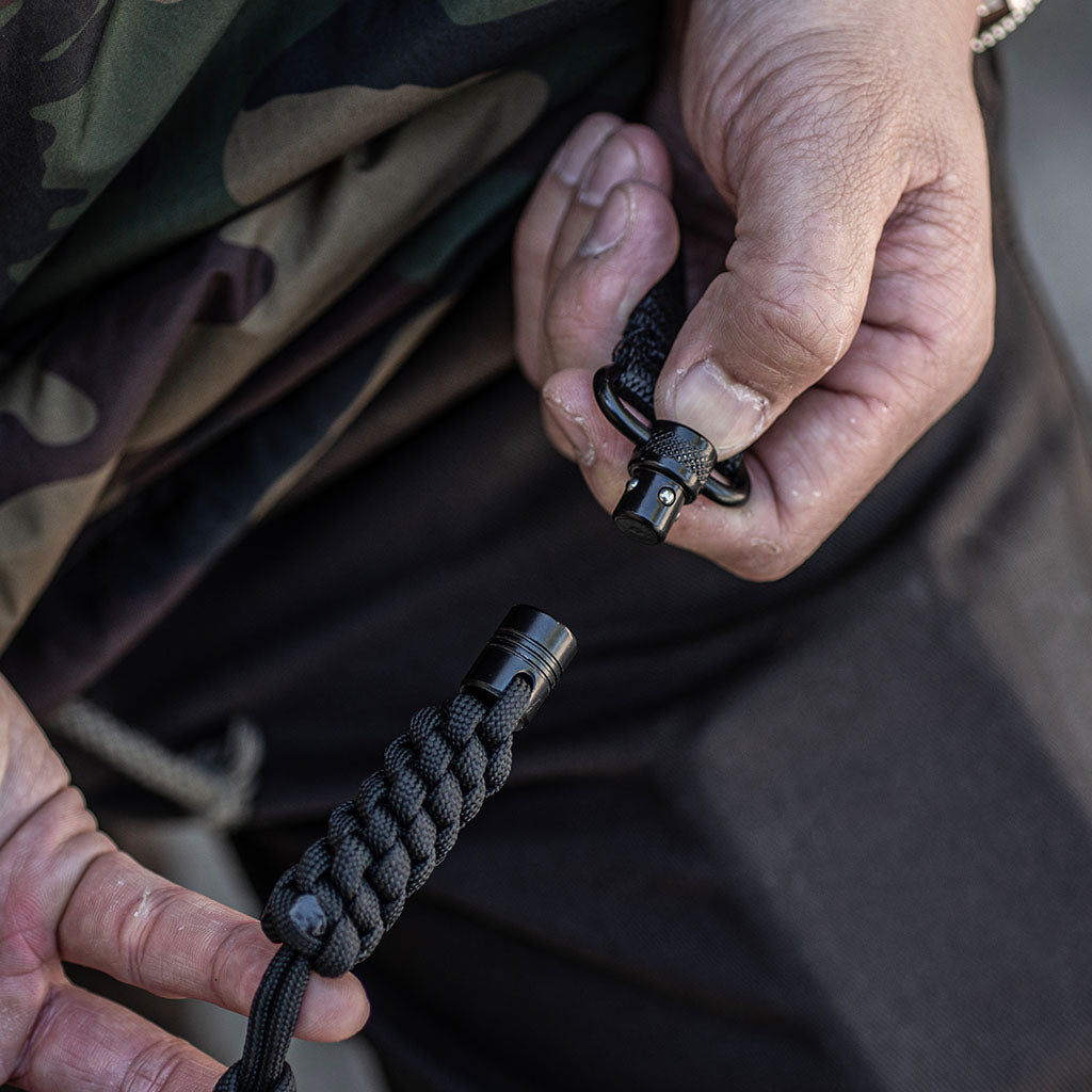 The tether features a stationary clip and nylon strap, securely fastening to your waist for easy attachment and removal. The paracord lanyard end provides the flexibility you need for everyday use, and the unique Crown Sinnet weave on the paracord end adds strength and visual appeal. The Crown Sinnet weave is a time-tested knotting technique known for its durability, offering a secure, tightly-woven structure that holds up to daily wear and tear.