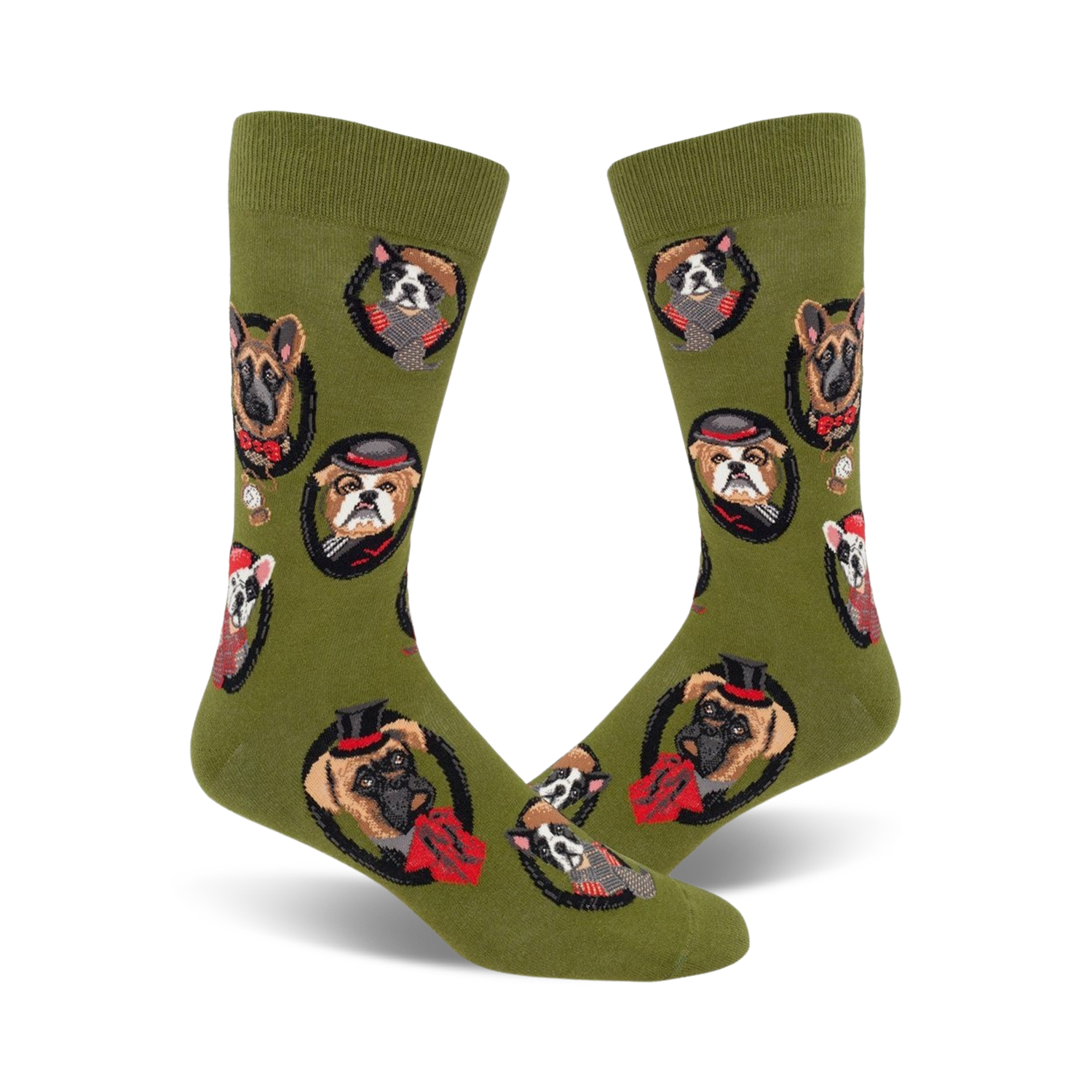 Paws for fashion! Meet Dapper Dogs, the crew socks that'll make your feet the talk of the town. Picture this: a pack of cartoon pooches, all dressed up in hats, ties, and bow ties, frolicking on a dark forest green background. These socks are so darn cute, they'll have you howling with delight. Plus, they're made for men, so you can strut your stuff in style.