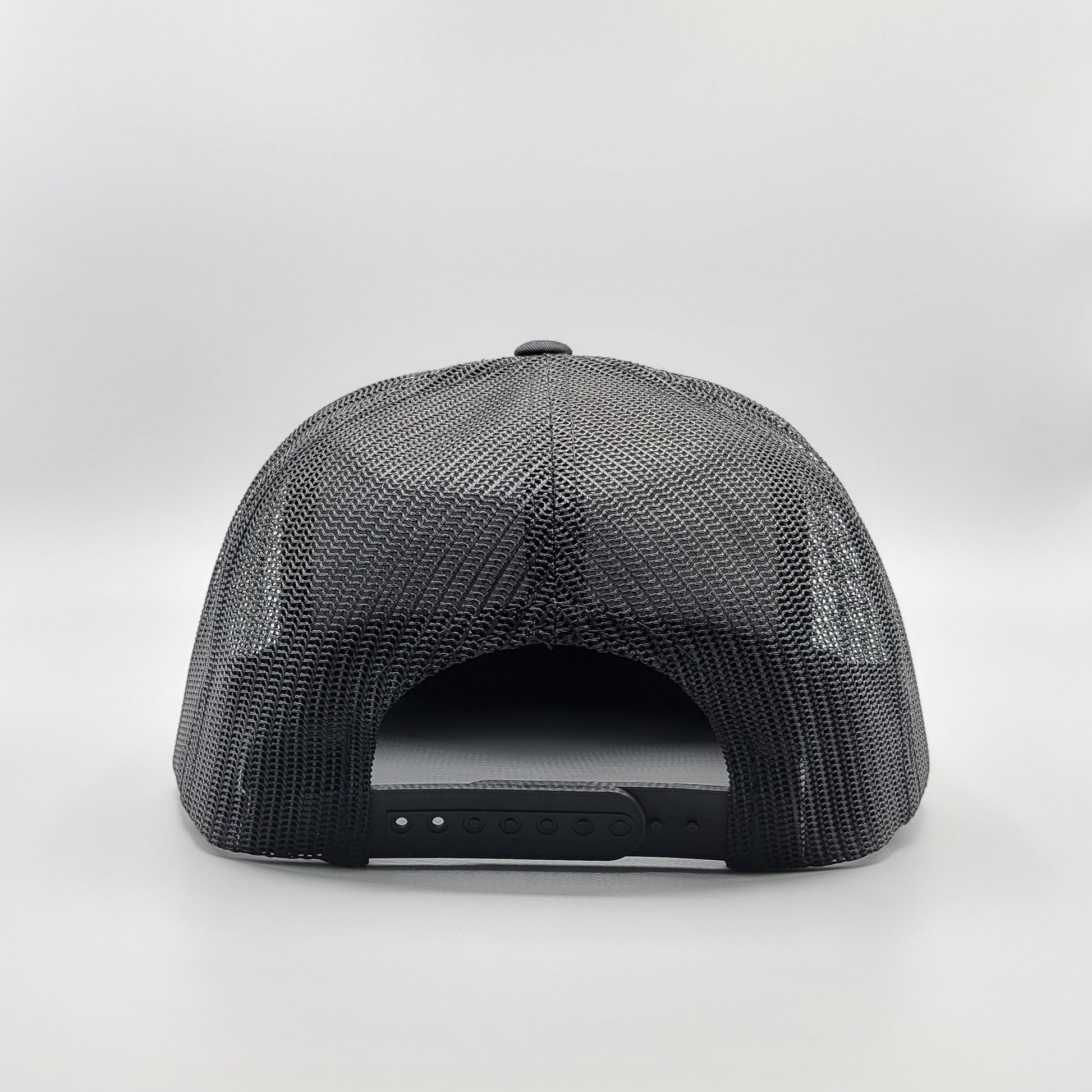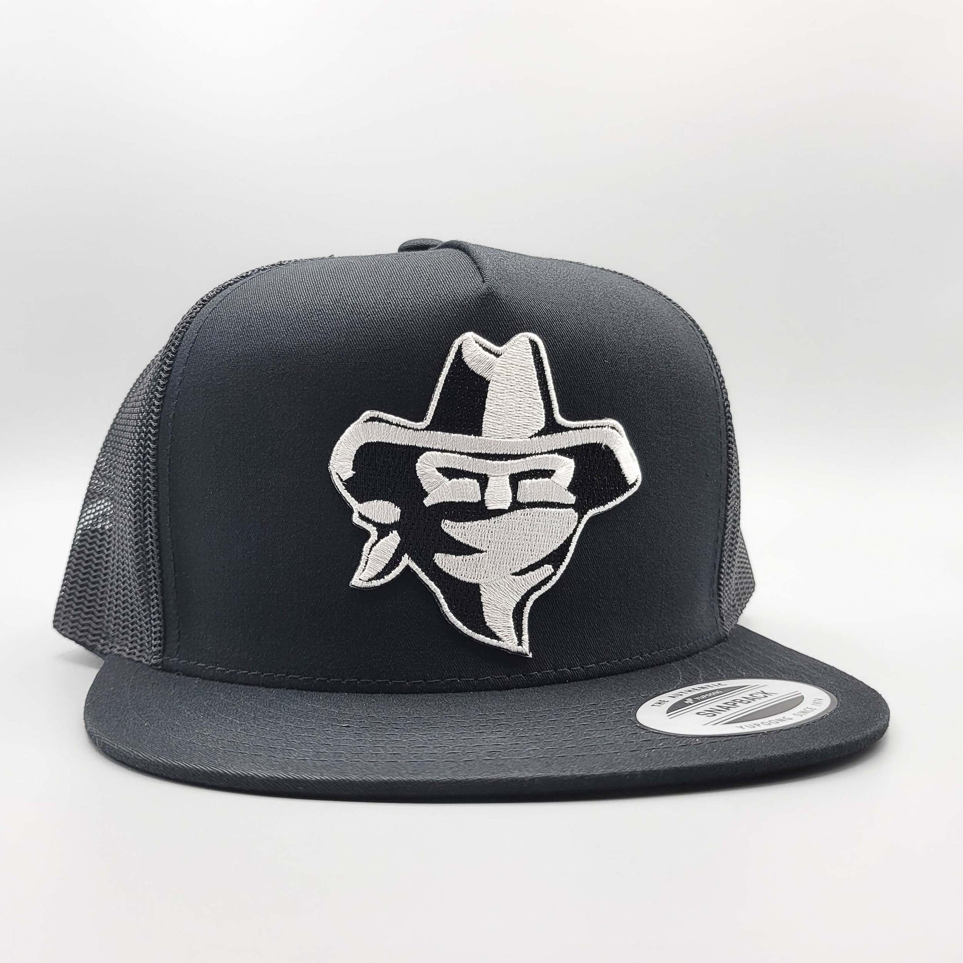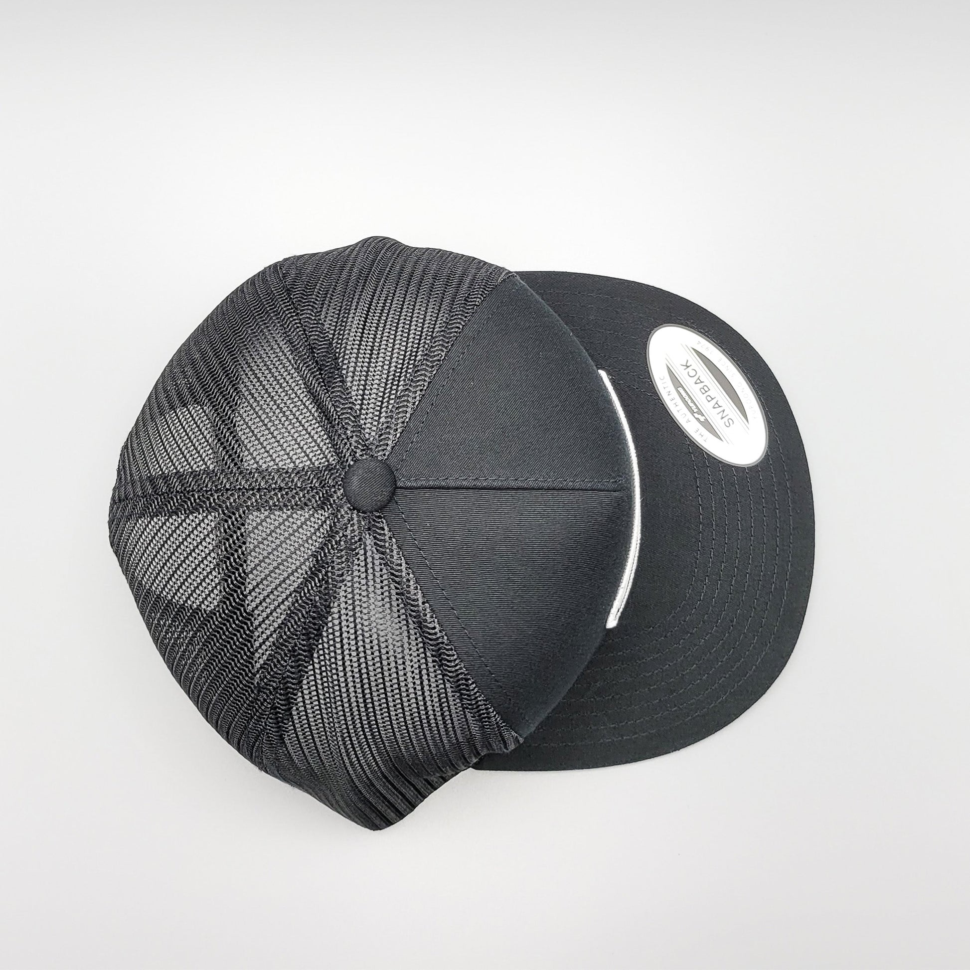 This vintage style patch is applied to one of our best selling trucker hats -- a black Yupoong 6006 Flat Bill Snapback Classic Trucker Hat. Get that great flat bill look in a snapback mesh baseball cap.