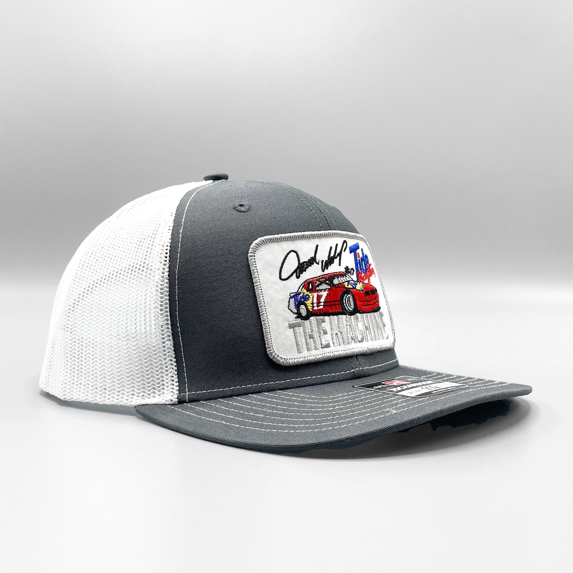 This trucker hat features a retro Darrell Waltrip Tide Racing "The Machine" Nascar embroidered logo patch on a charcoal gray and white mesh premium Richardson 112 snapback baseball cap.