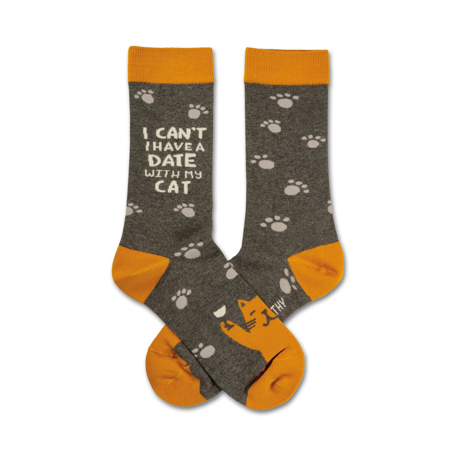 Life's too short for boring socks. Date With My Cat socks let your personality shine, featuring playful white cat paw prints all over a groovy gray background. Plus, they have a bright orange cuff, heel, and stitched words that read: 'I can't, I have a date with my cat.' Wear these comfy crew socks and show the world your unyielding devotion to your feline friend ”me-yow!