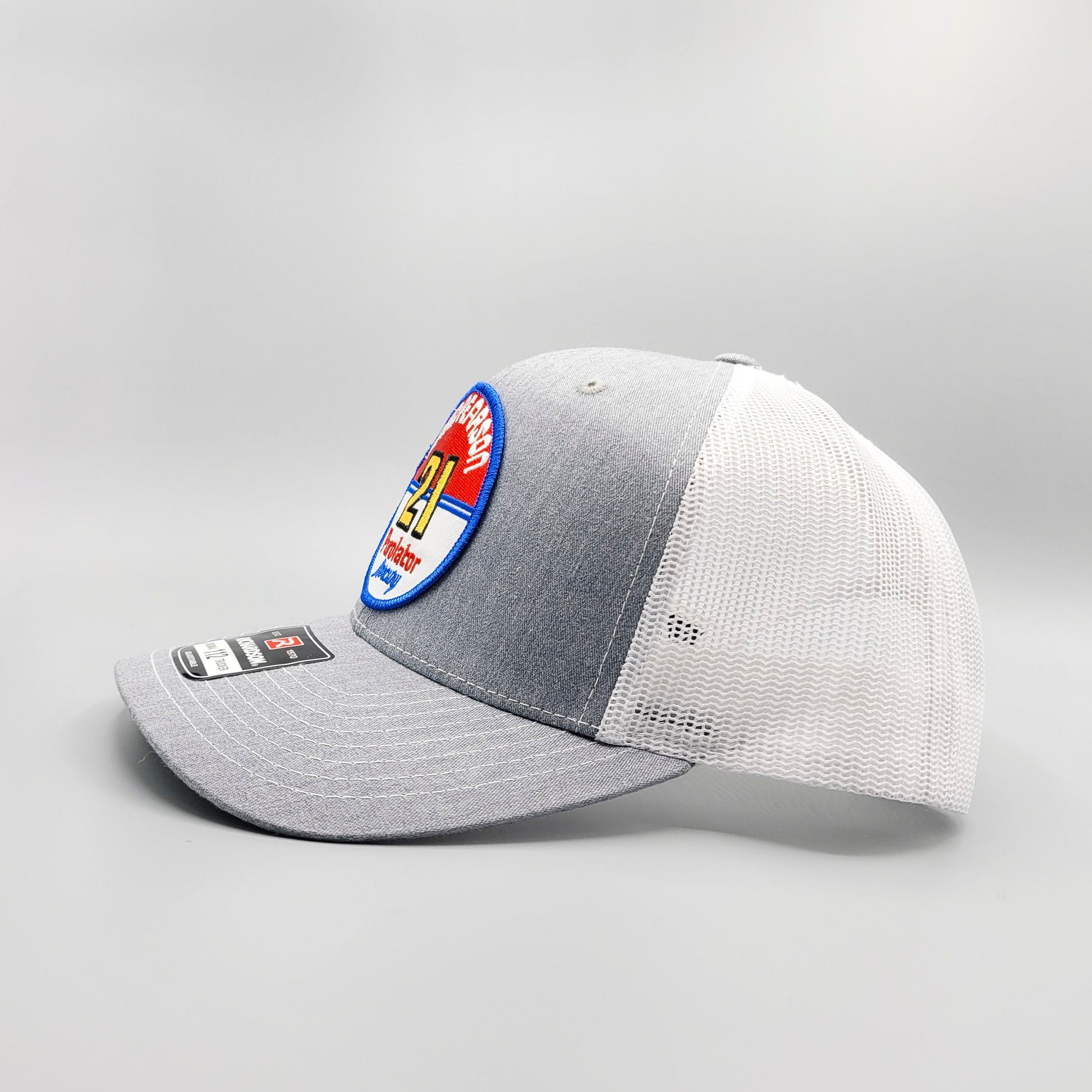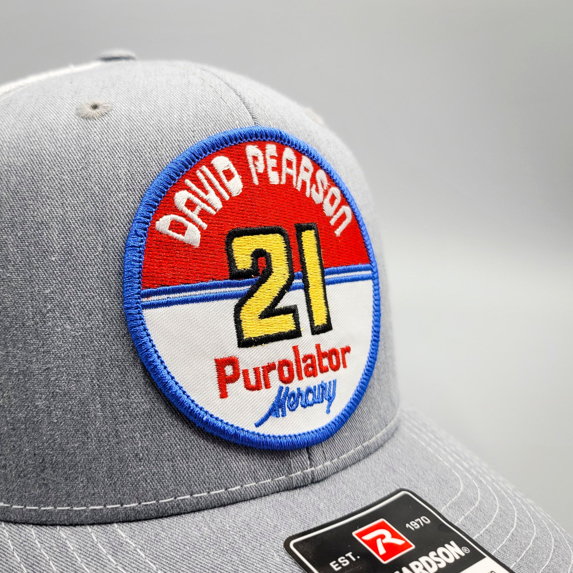 This vintage trucker hat features a heather gray and white mesh colorway with a embroidered patch honoring legendary racing driver, David Pearson. The David Person #21 Purolator Mercury Racing embroidered patch is on a new Richardson 112 mid-profile snapback trucker hat.