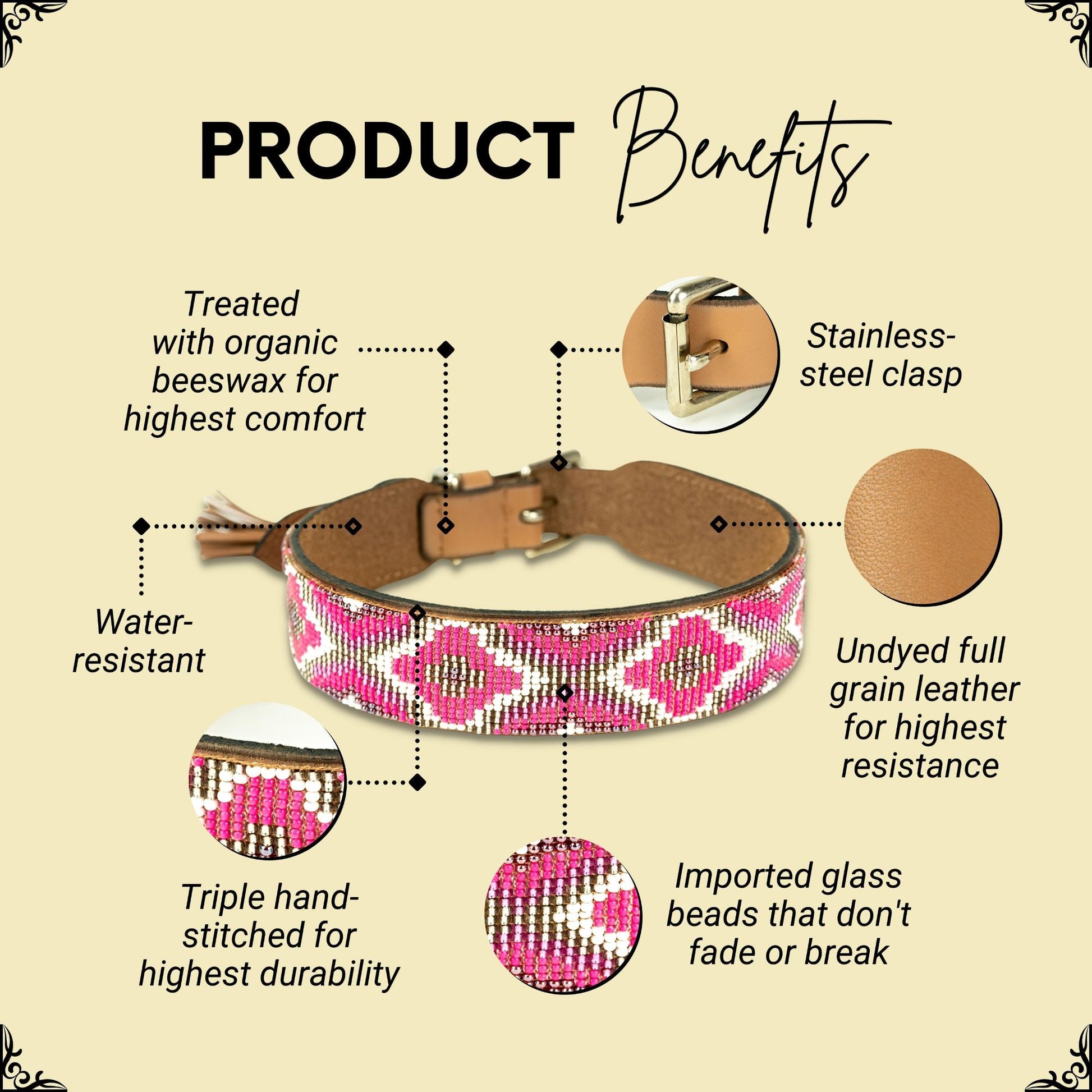 - Pliable and un-dyed full grain leather to make the collar ultra soft and cozy to wear. No plastic, No Nylon, No Chemicals or Artificial coloring!