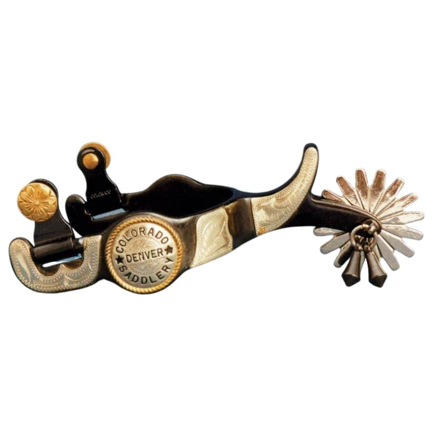 This spur reflects quality that goes along with the Colorado Saddlery Logo. Blue steel with engraved overlay, brass rope edge conchas, brass buttons and stainless steel rowels, this spur is truly a classic! The black jingle bobs for a "bell-like" jingle.