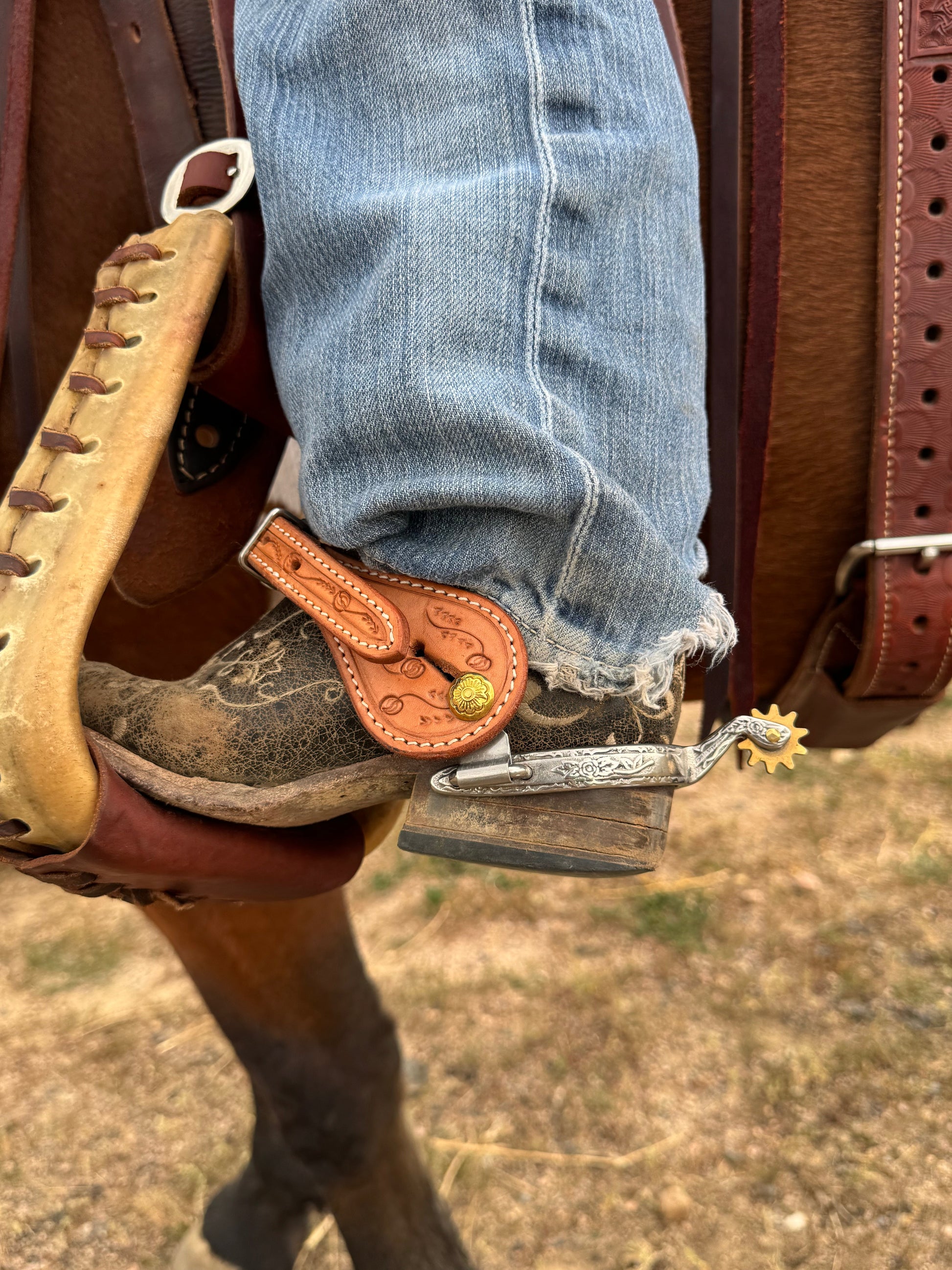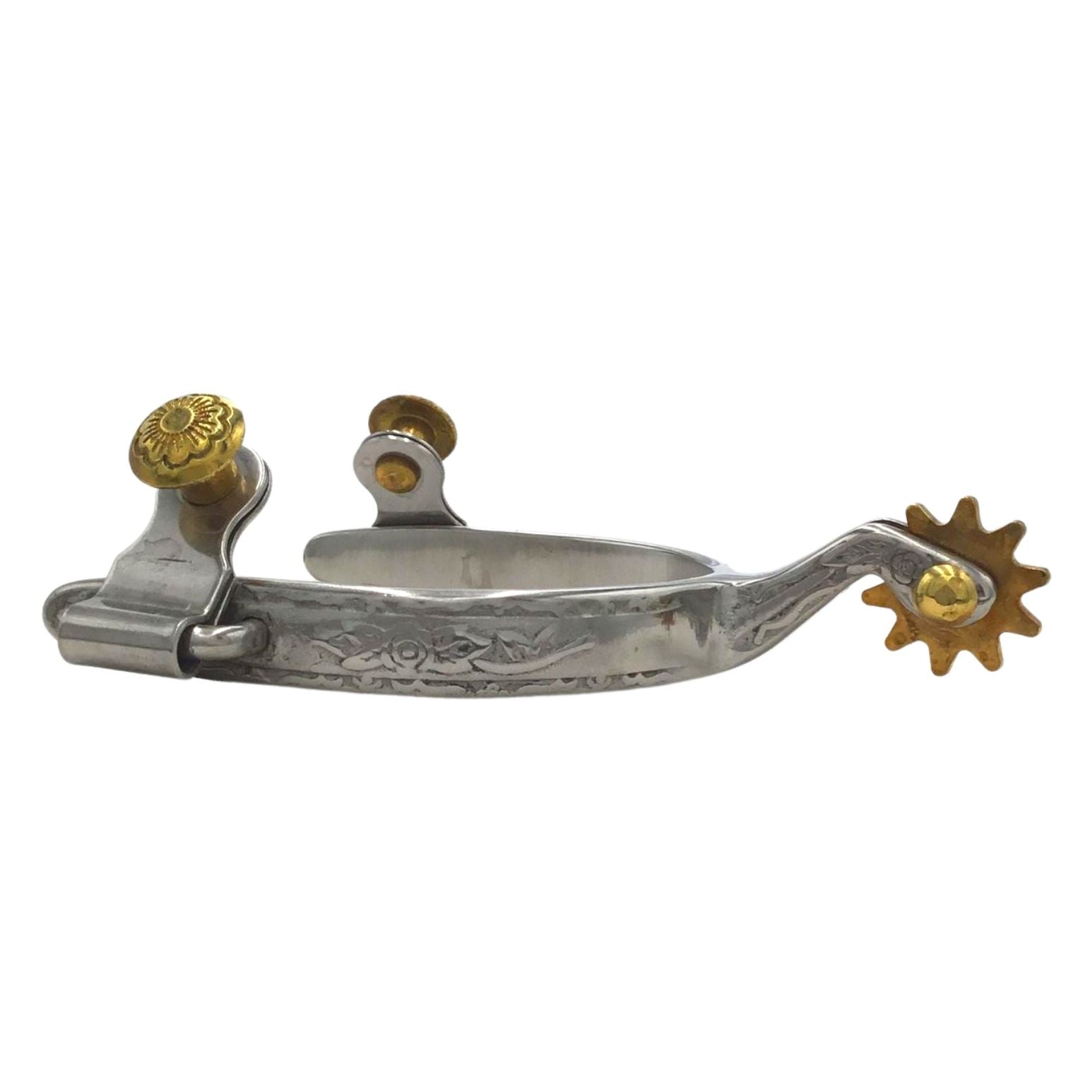Beautiful and functional, Desert Rose Spurs combine elegant design with practical performance. Crafted from stainless steel, these spurs feature a desert rose design on the ½" band, a 1½" shank, and brass rowels with brass buttons for reliable cues in the saddle.