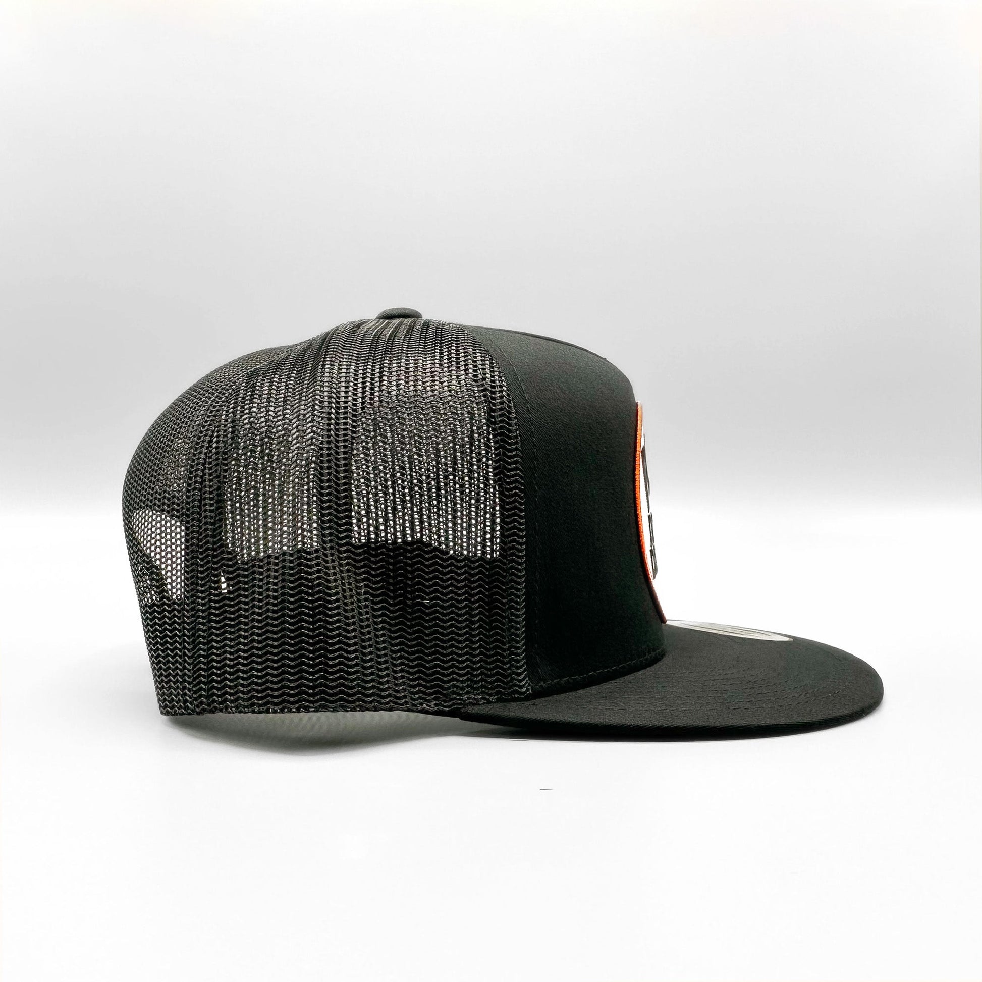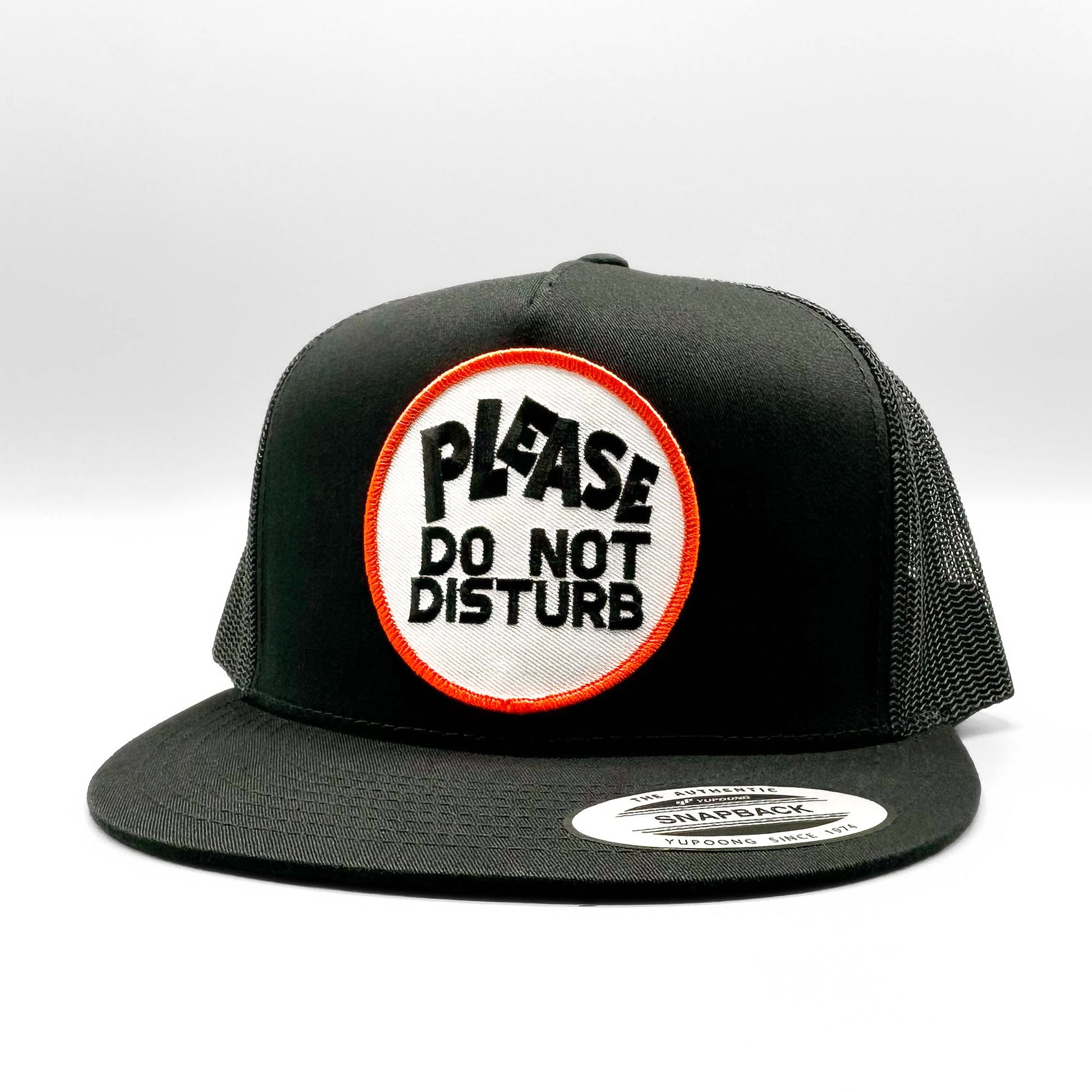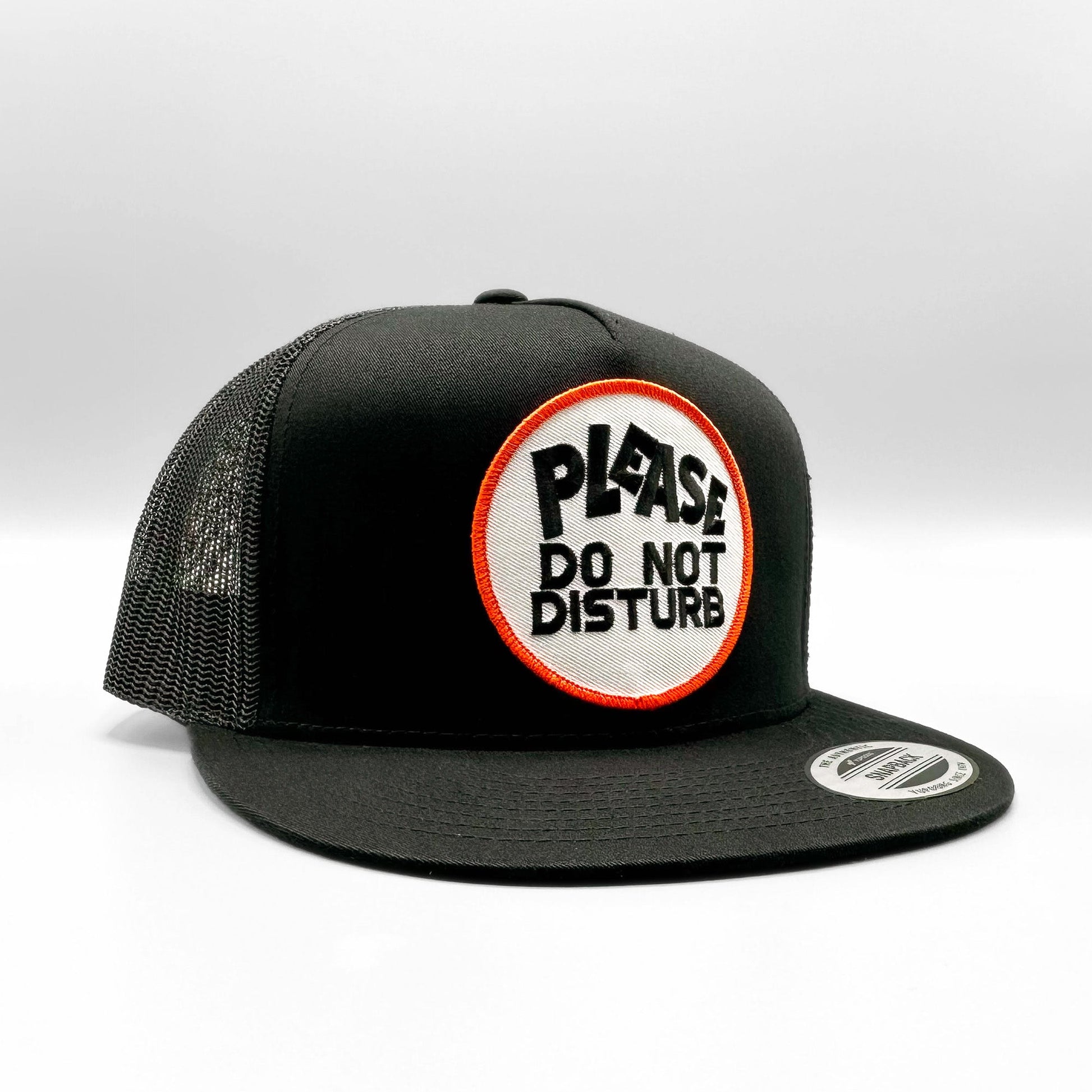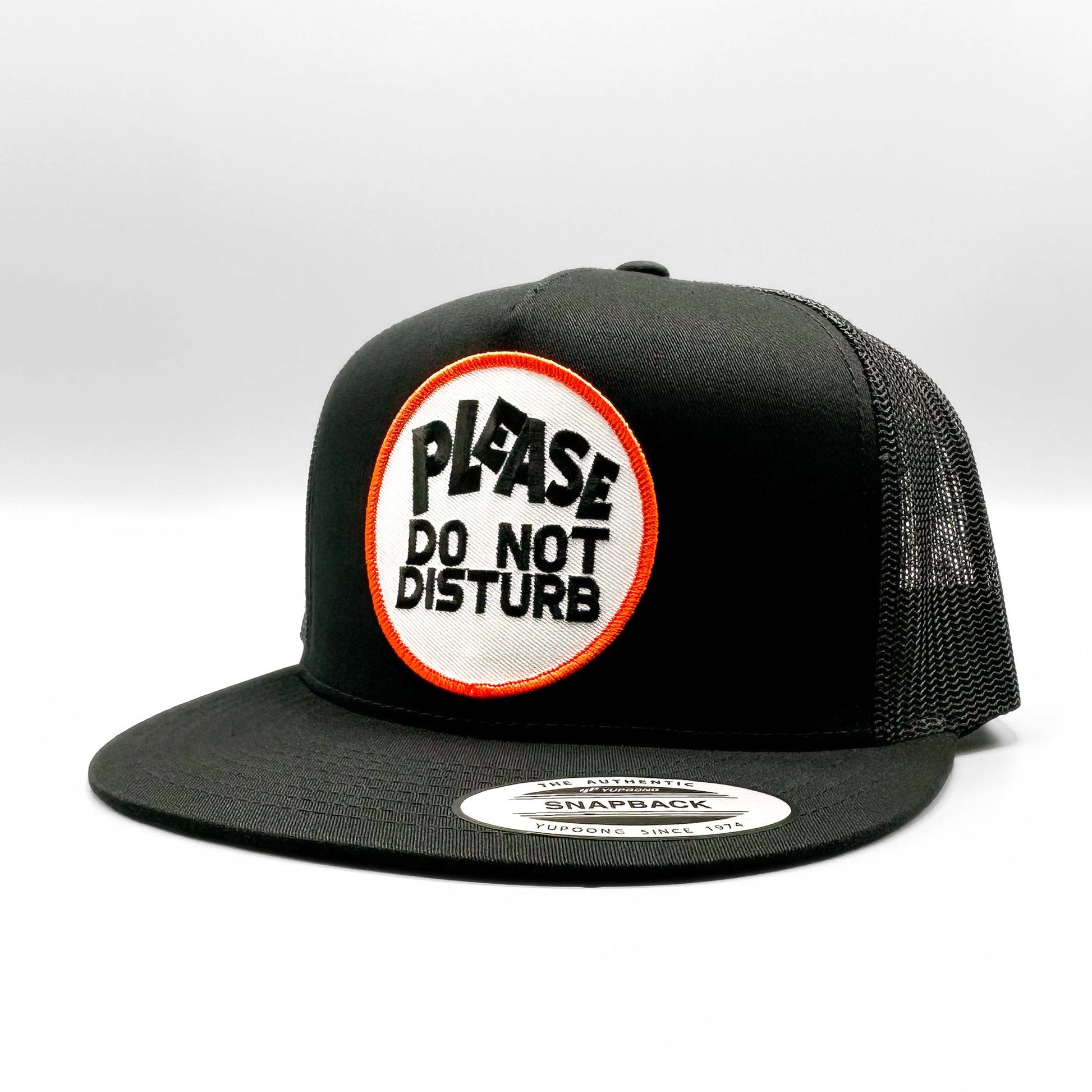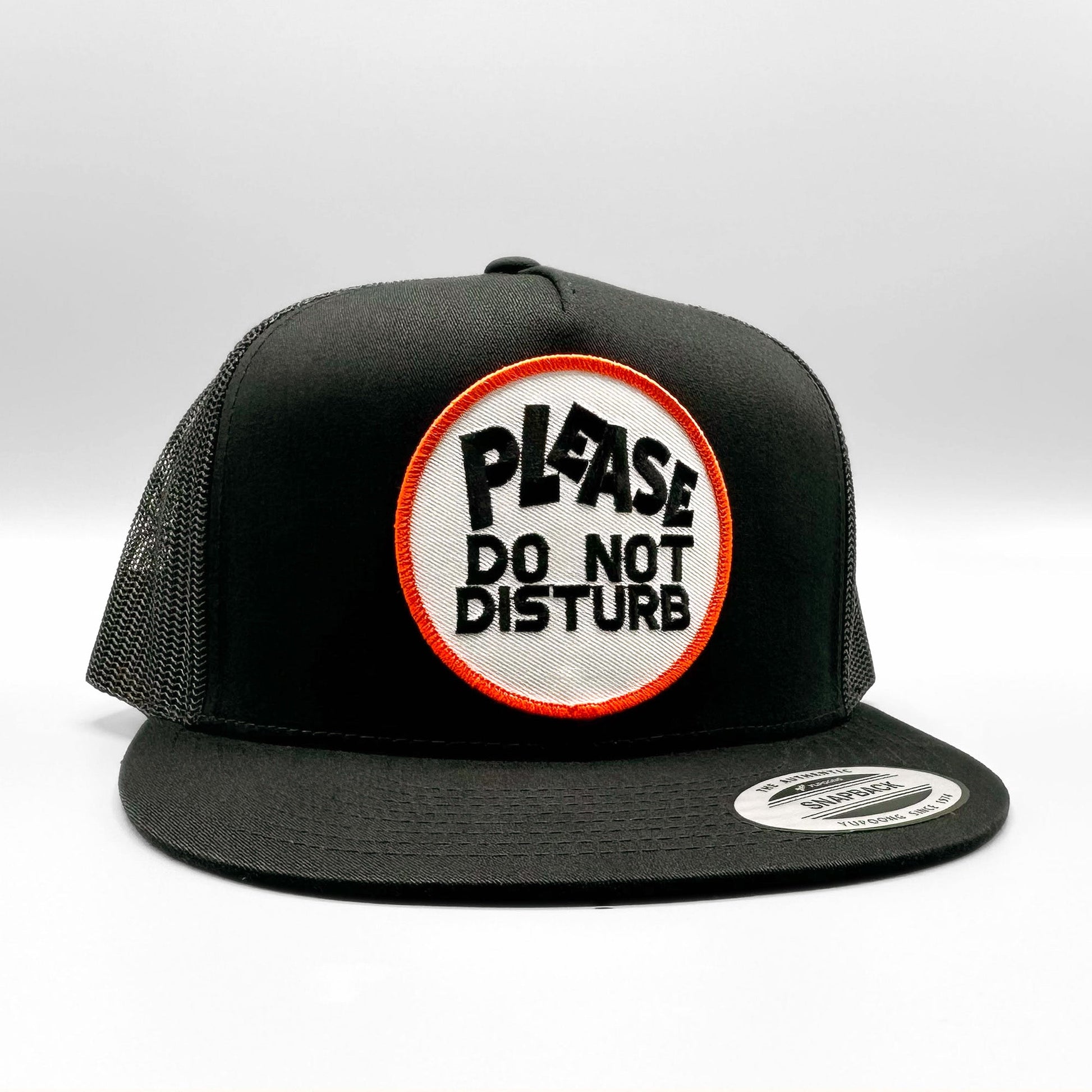 This trucker hat features a funny, "Please Do Not Disturb" embroidered patch on one of our best-selling (and best fitting) baseball style trucker hats -- a black Yupoong 6006 Classic snapback trucker hat.