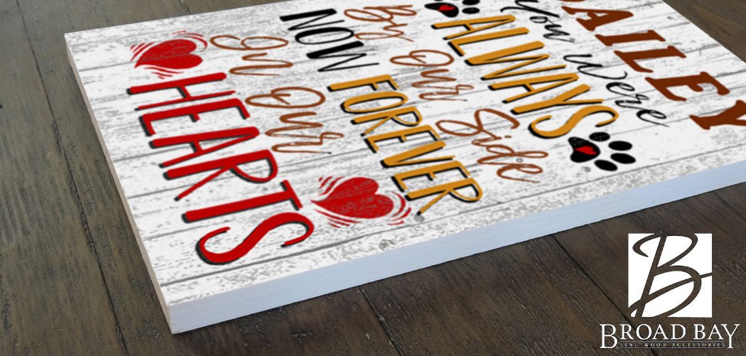 This top quality personalized You Were Always By Our Side, Now Forever In Our Hearts dog memorial sign is the perfect custom-made gift idea for any dog lover missing their canine companion. Carefully crafted from solid wood, this unique wall mounted decorative memorial sign will be cherished for years to come. The 'Now Forever In Our Hearts" design is carefully applied to the wood in a unique process developed by Broad Bay. A unique, customized gift that will serve as a loving keepsake, this dog memorial sign measures at 16.5 in x 10.5in. Personalized with your dog's name, this top quality memorial sign is perfect in any room.