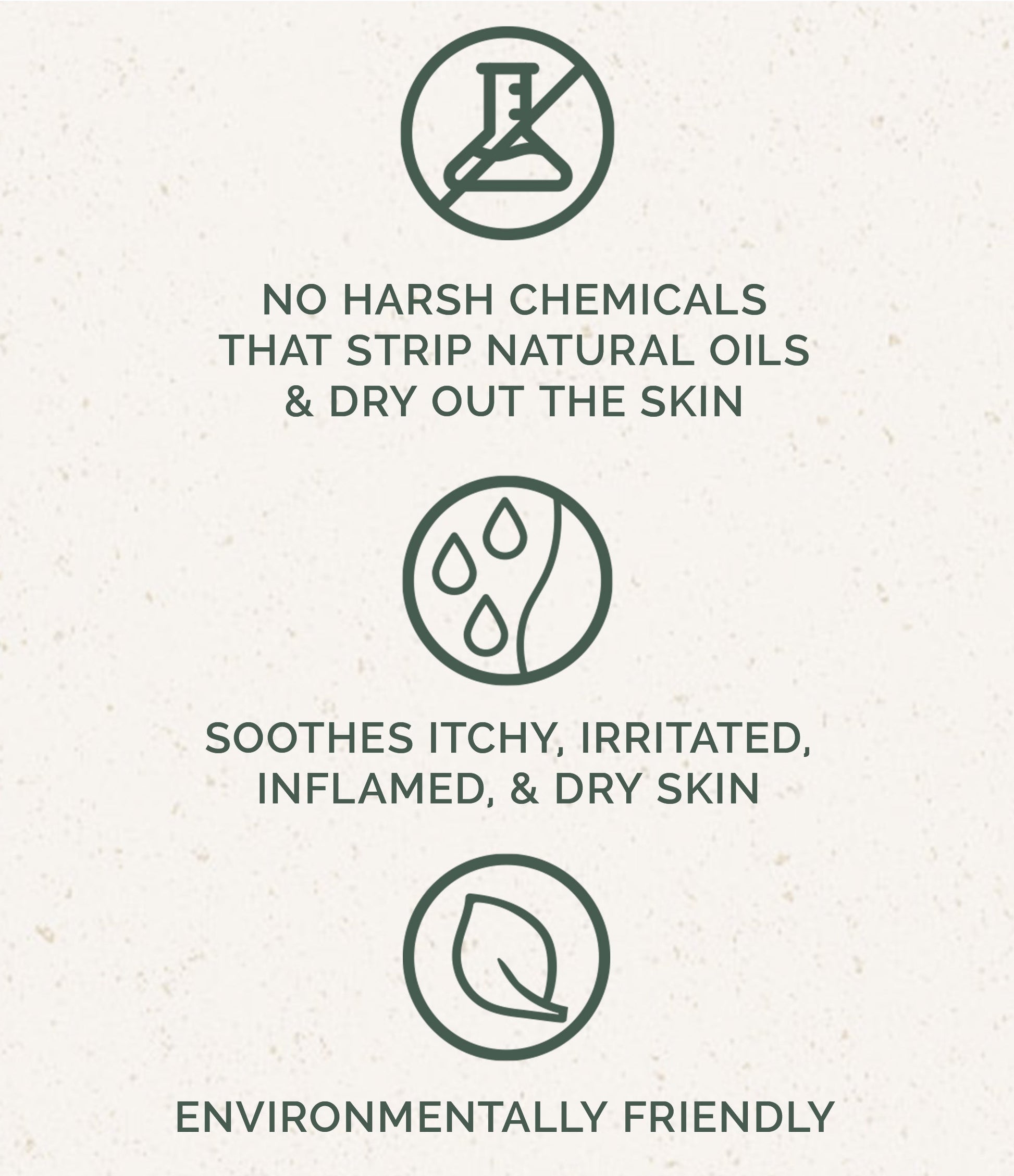 The finely ground oats, honey and cornstarch in this natural dog shampoo, help soothe and heal itchy, irritated, inflamed, and dry skin.