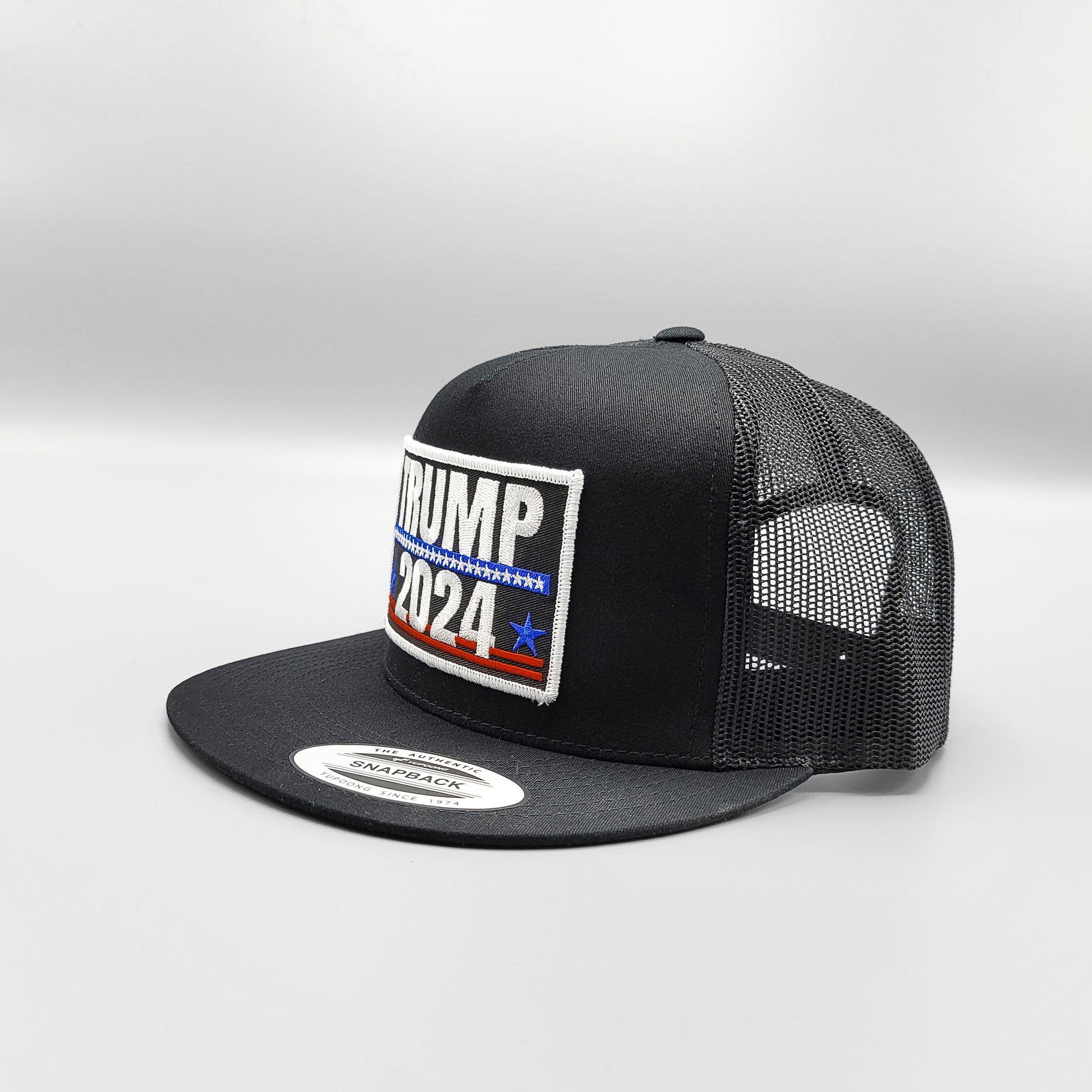 This listing is for a Donald Trump 2024 embroidered red, white, blue and black campaign patch on one of our best selling (and best fitting) baseball style trucker hats -- an all black Yupoong 6006 classic snapback trucker hat.