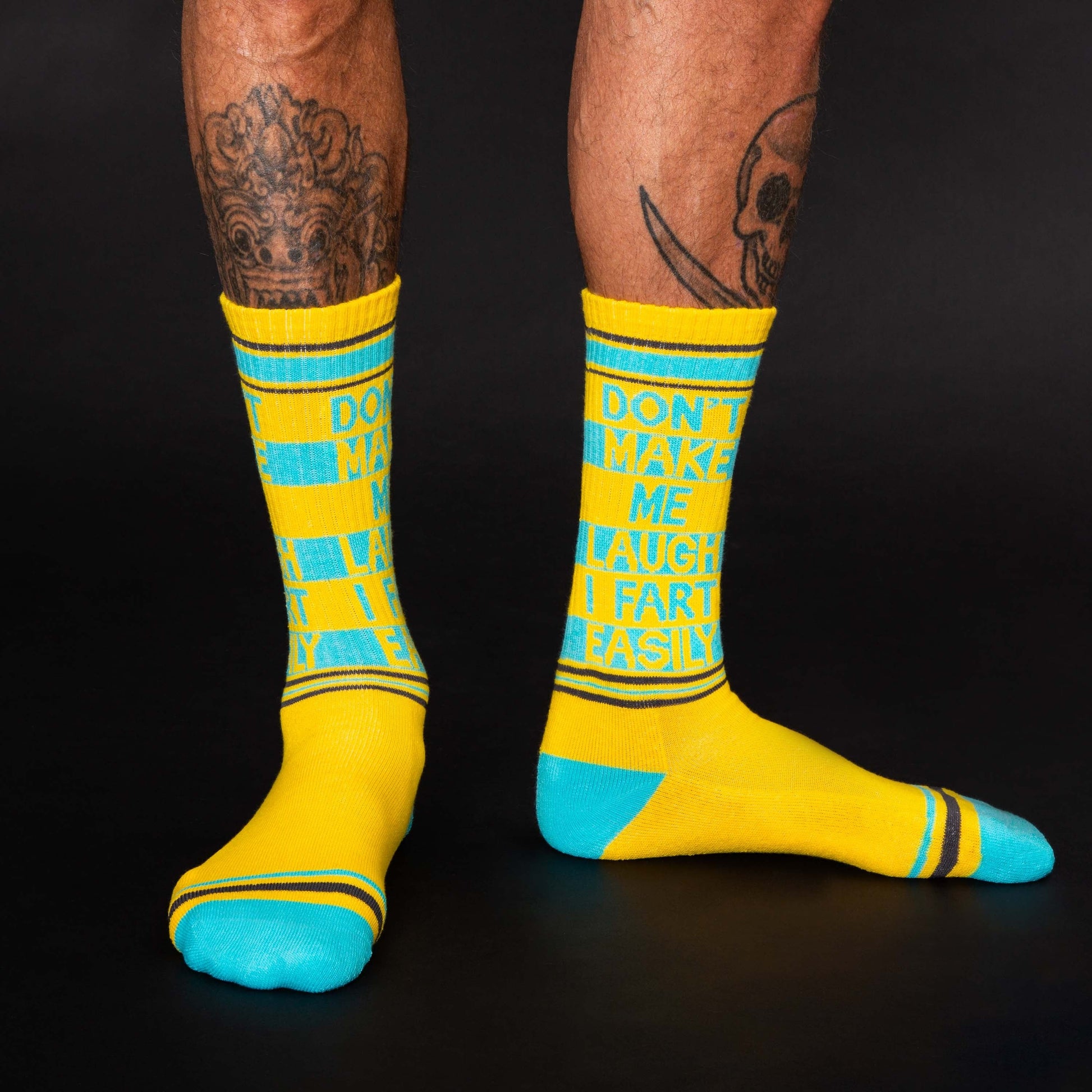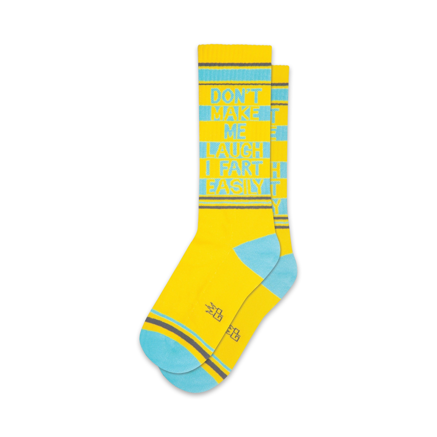 These are not just socks, they are laugh-provoking accessories! Show off your humor in these eye-catching socks that scream "Don't Make Me Laugh...I Fart Easily." Perfect for ice breakers, these socks will have everyone chuckling. Strut your stuff in these hilariously honest socks, and who knows, you might just spread a little joy and laughter wherever you go!