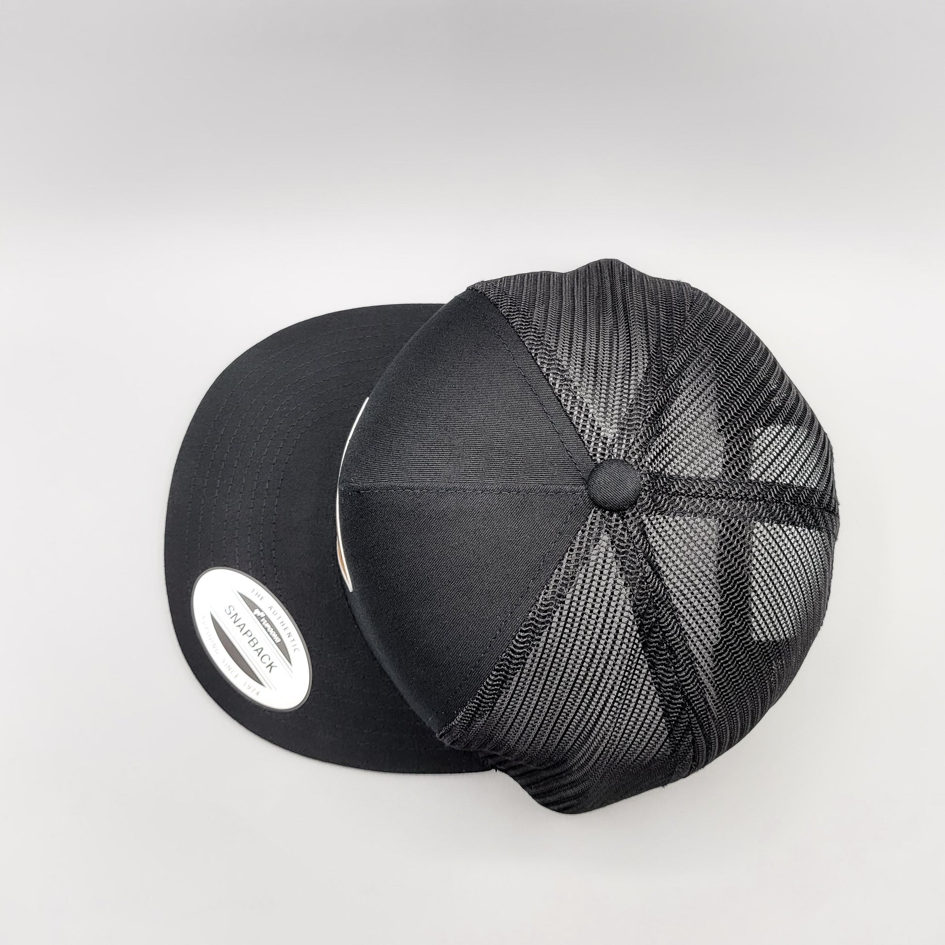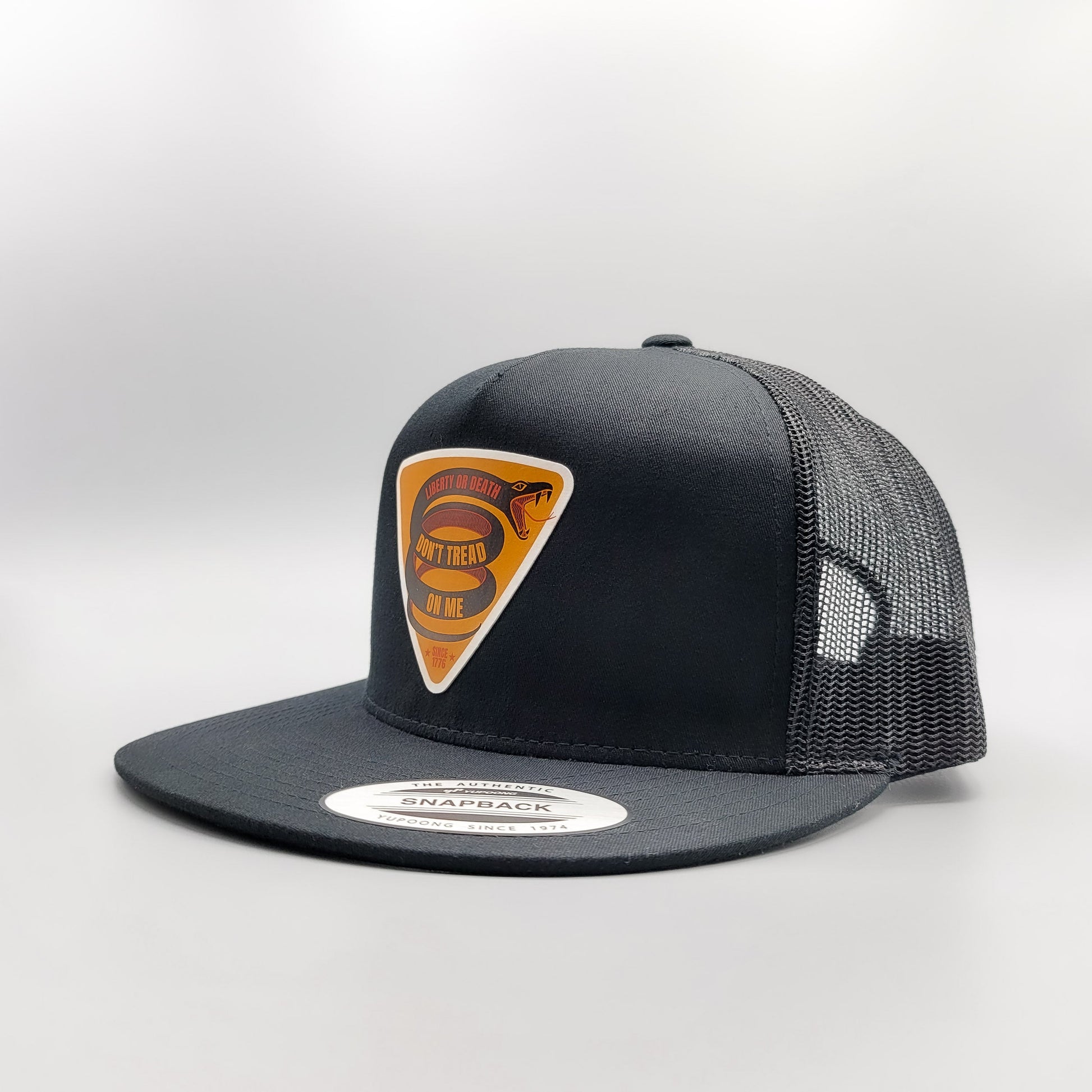 Gadsden Flag Patriotic "Don't Tread on Me" alternate triangle design in traditional yellow-gold applied to a new Yupoong 6006 Flat Bill Black Snapback Trucker Hat.