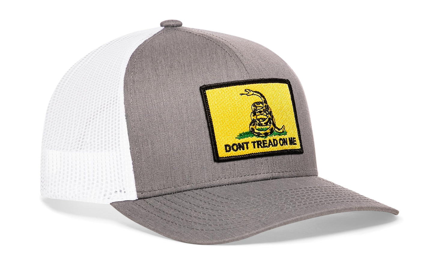 Rep your independence in style with the HAKA Dont Tread On Me Trucker Hat, featuring a premium Gadsden Flag Yellow embroidered flag patch on our gray-white signature 5.0 trucker.