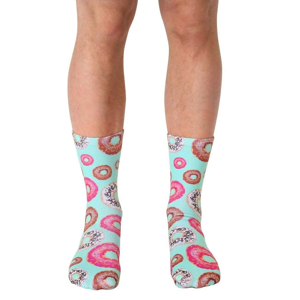 These 'Donuts' socks are pretty sweet. The visible portion shows a pastel mint green background with a fun pattern of donuts in pink, brown, and white. Some donuts have sprinkles. They're crew socks, shown on a model's legs. Perfect for adding a touch of whimsy to your day, or just because donuts are awesome. They're comfy enough for all-day wear, but stylish enough to be seen.