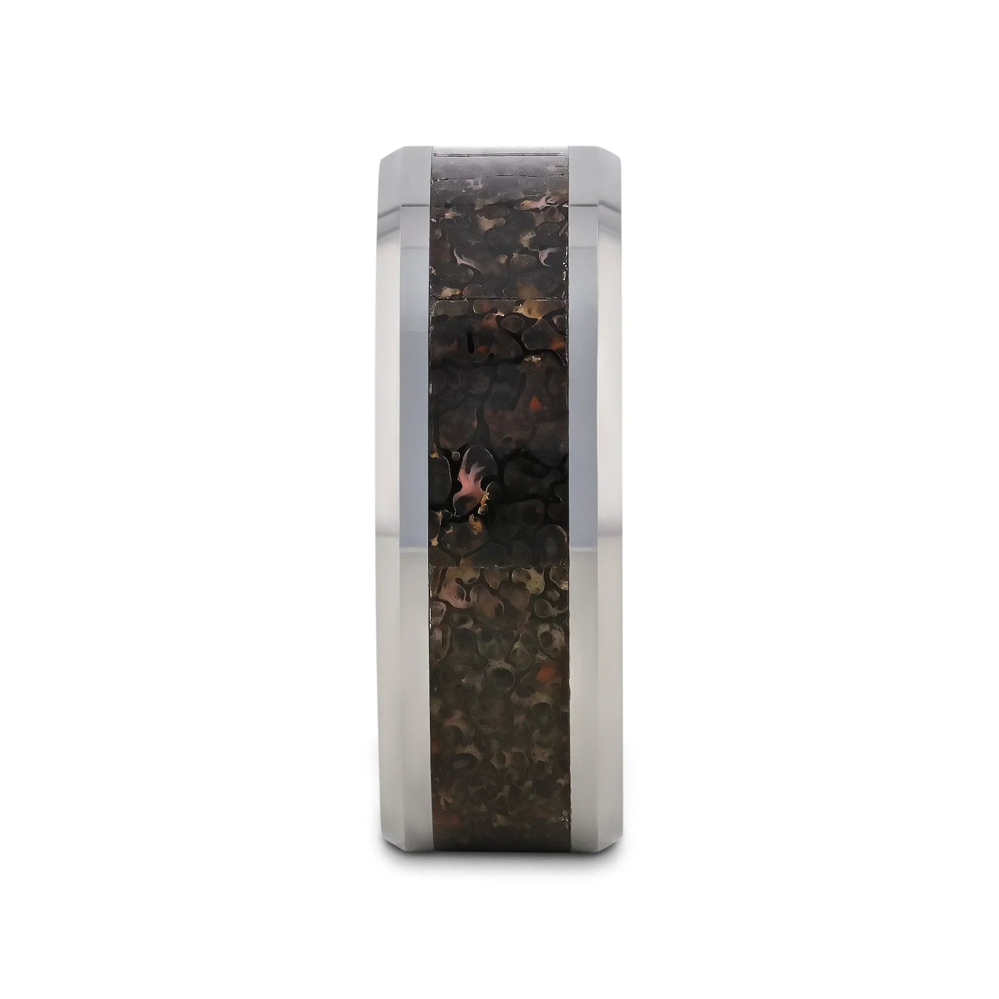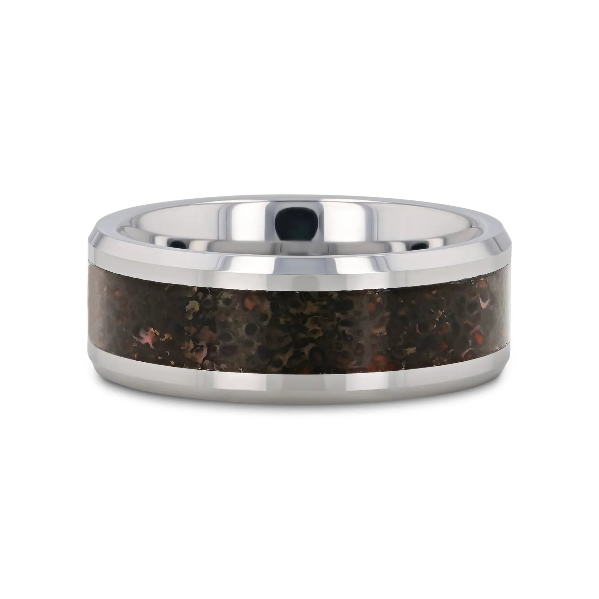 A wedding band by Thorsten 230 million years in the making. Carefully excavated authentic mineralized black-hued dinosaur fossil with touches of red and gray cut and inlaid to this scratch-resistant, ultra-durable Tungsten Carbide band by Thorsten.