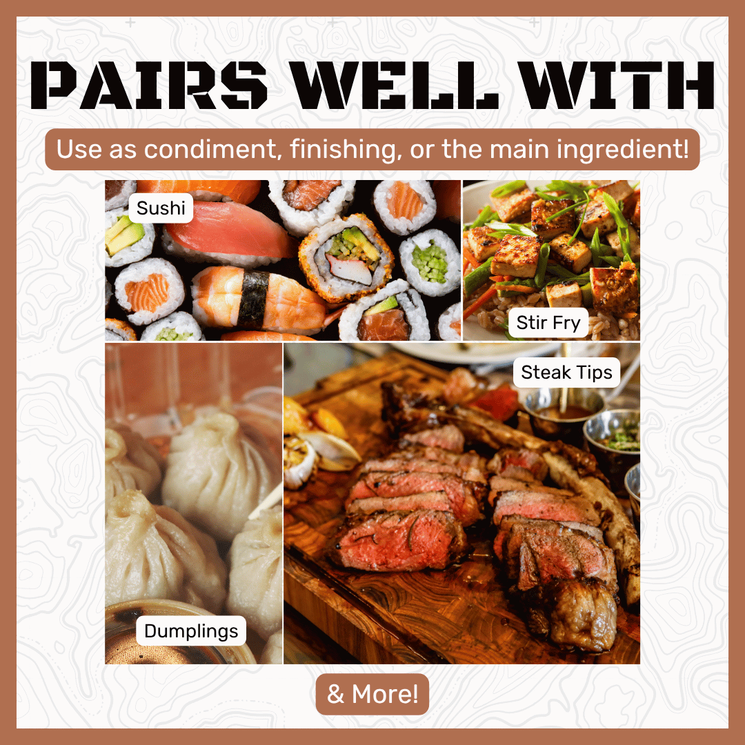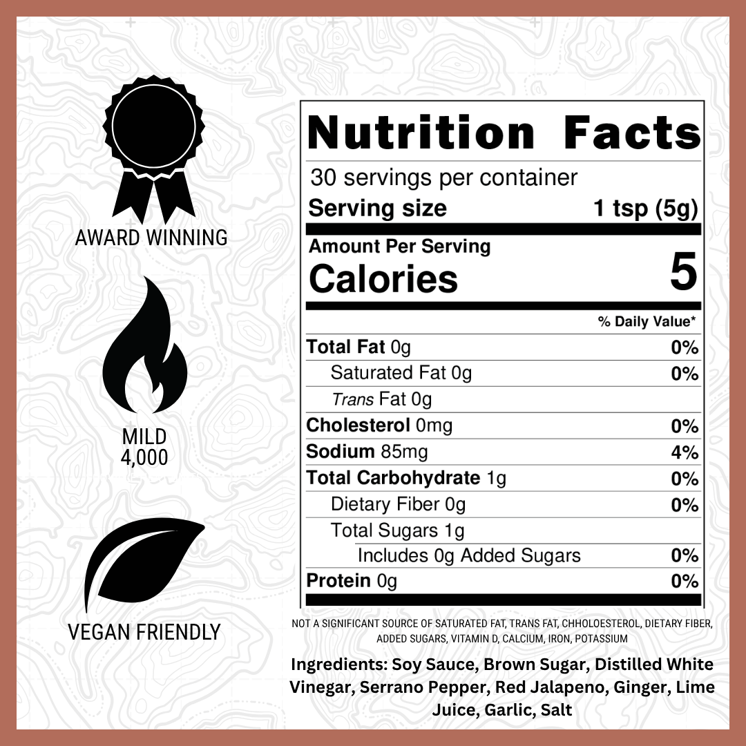 Our most award winning sauce - A fusion of soy sauce, brown sugar, and our unique sriracha twist. Perfect as an everything sauce, begging to elevate your sushi-dipping game or infusing a savory kick into steaks, shrimp, and so much more.