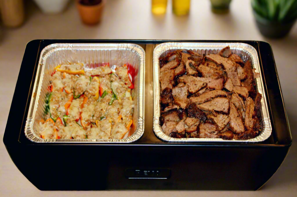 Introducing the Dubler HEAT - a modern and innovative solution that combines a flameless chafing dish and cooler, perfect for all your catering needs. Unlike traditional chafing dishes, the Dubler HEAT doesn't generate heat. Instead, it relies on premium insulation, microwaved heat packs, and placing hot food trays straight from the oven to provide a slow drop in temperature over time. With the Dubler HEAT, you can fit two 1/2 size food pans up to 4” deep - that's more than the 2.5” depth in standard chafers. Plus, the outside remains safe to touch, allowing for easy mobility.