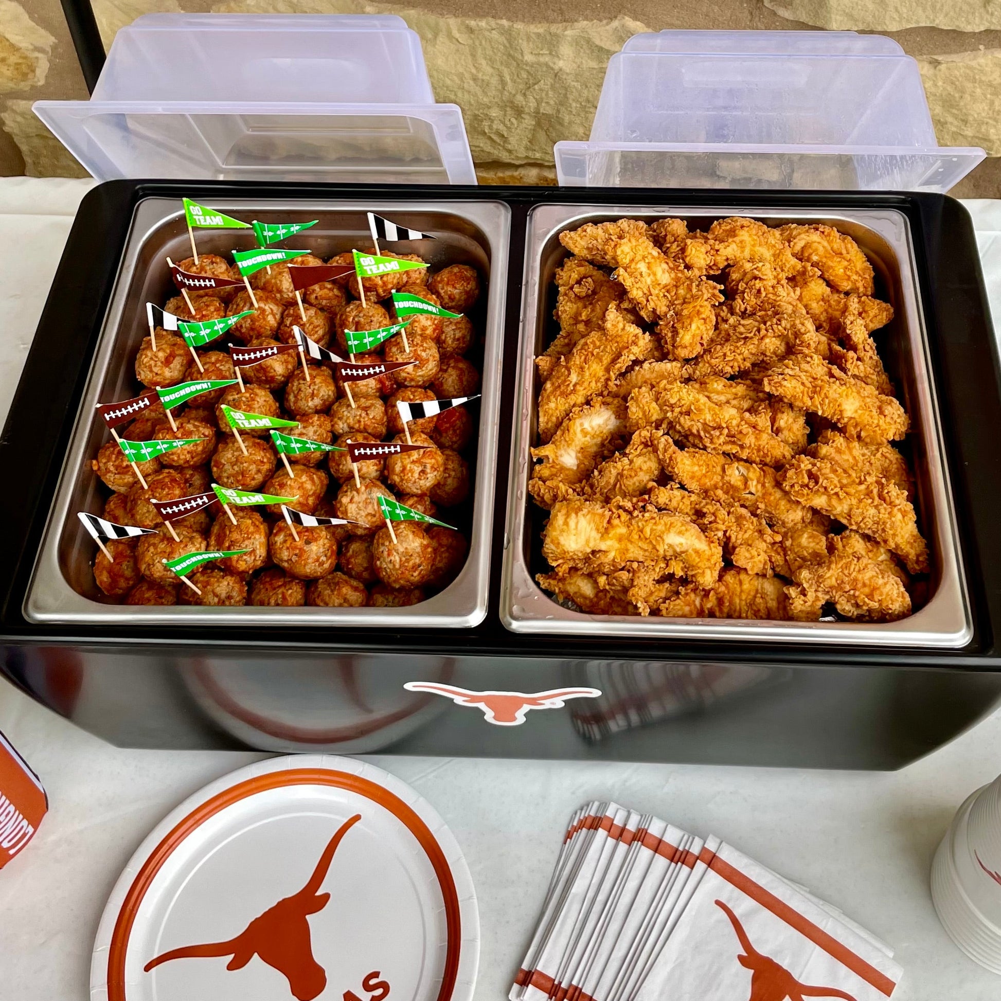 The amount of time your hot food will stay warm depends on several variables. Drop in microwaved heat packs and hot food pans straight out of the oven, then cover. Dense foods like lasagna will stay hot longer than something like chicken wings. The amount of service with lids off will also have an effect. Most service is within an hour or two and your food will be hot. If covered and untouched for later service, you should still be serving warm food up to 5 hours later. Additionally, the Dubler HEAT can also be used as a food warmer for transportation.