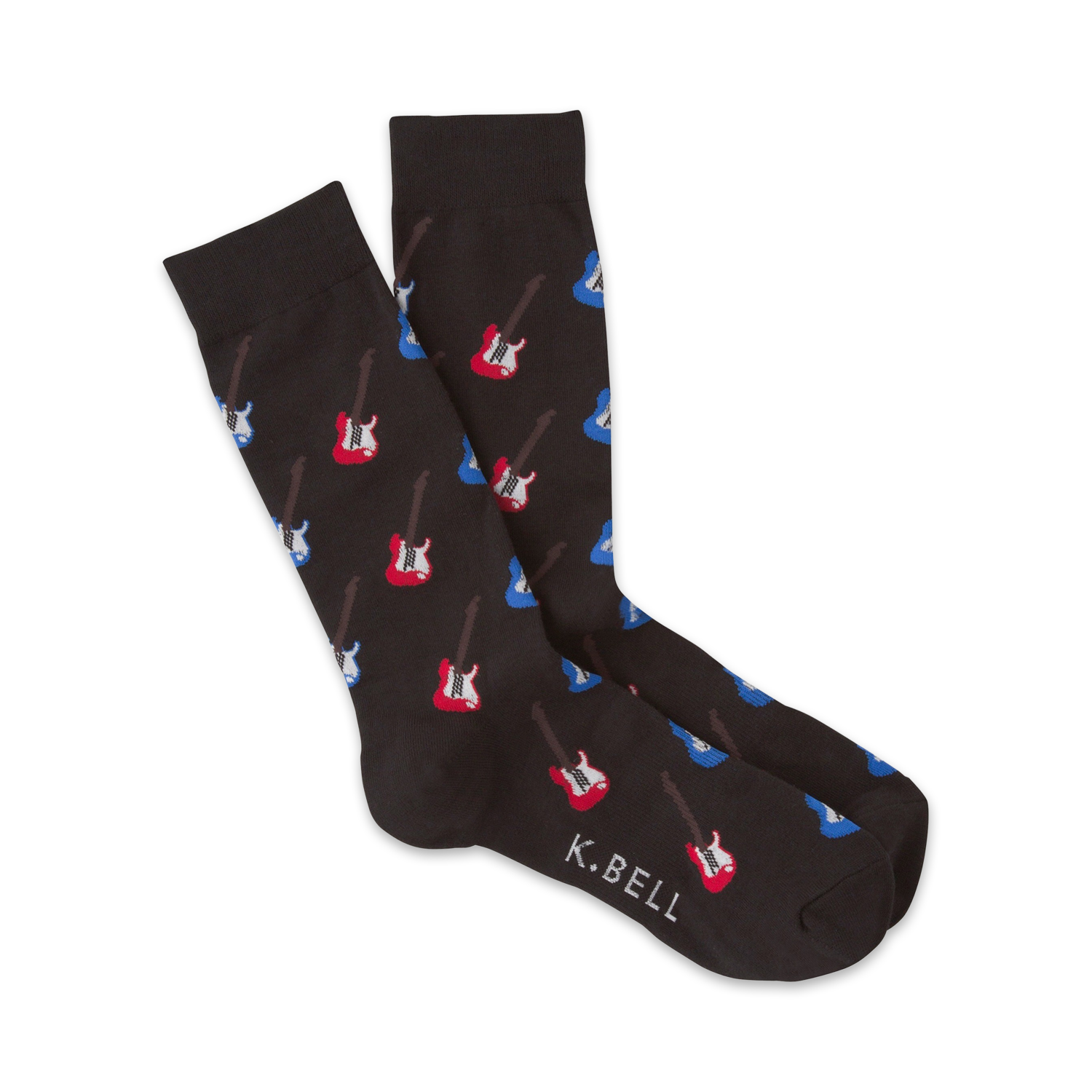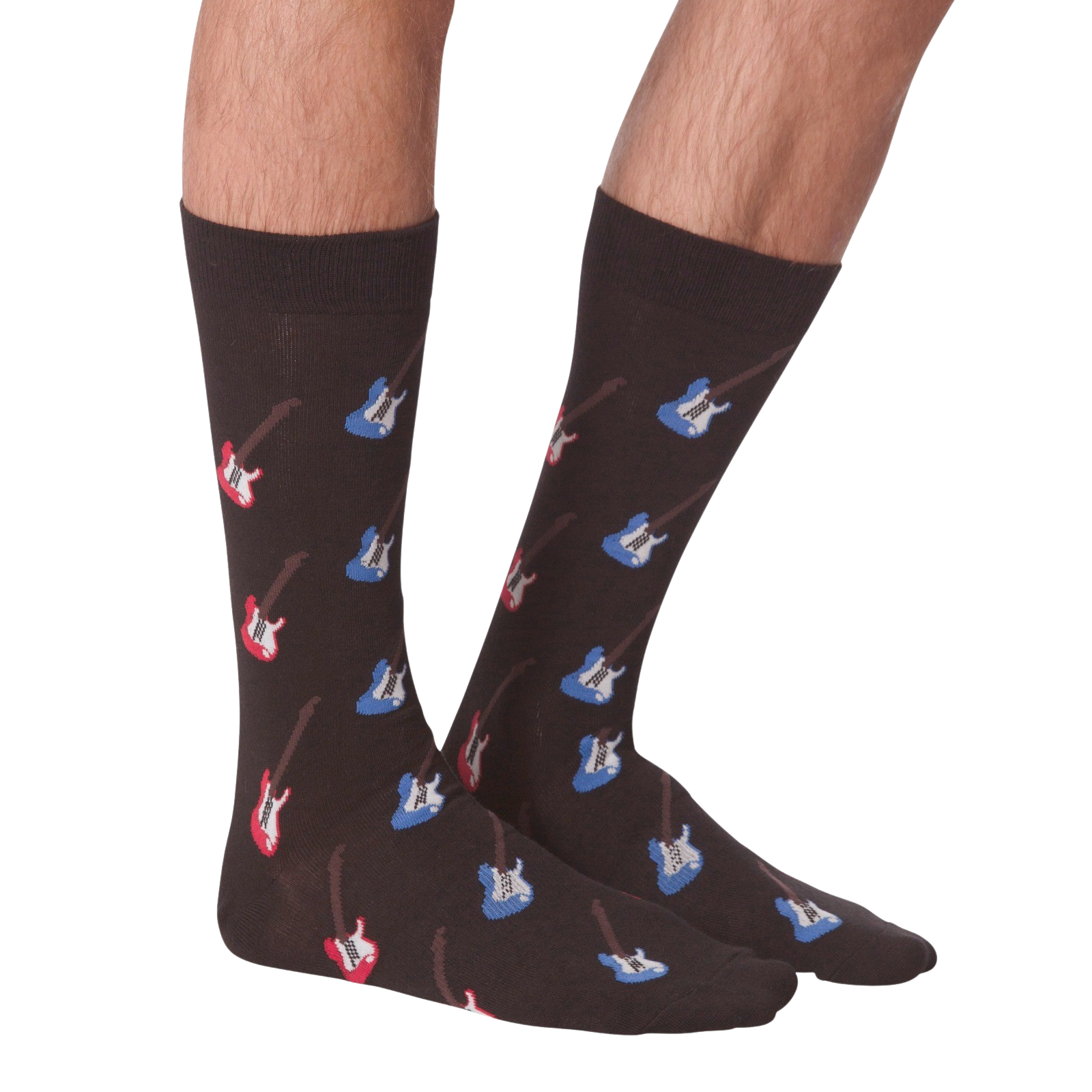 Strumming into view, these brown crew socks are covered in an allover pattern of vibrant red and electric blue guitars. Perfect for any music lover, these socks will rock your world! Whether you're headbanging at a concert or just chillin' at home, these socks will keep your feet in tune.