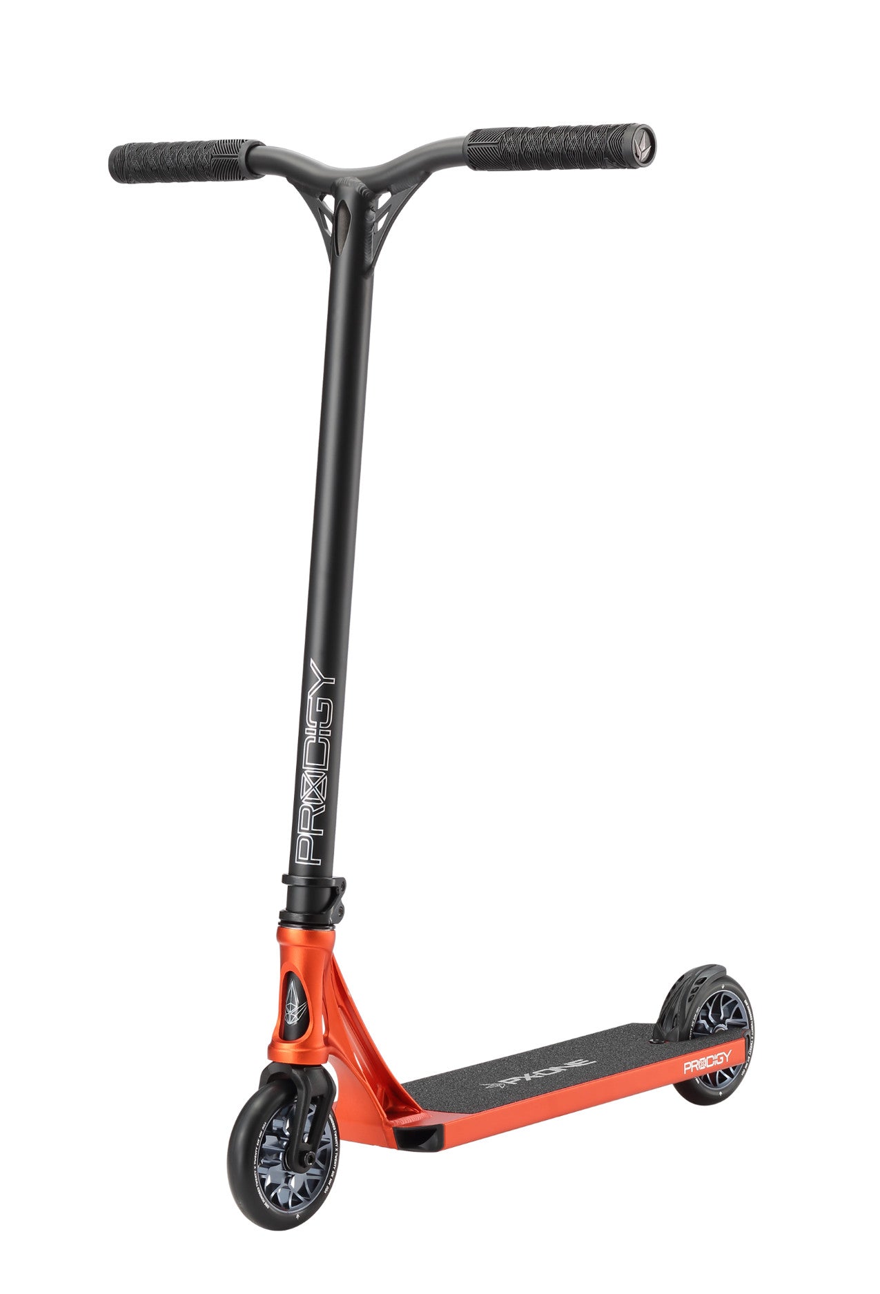 The Prodigy X ONE - PX ONE for short is the eleventh series in the PRODIGY line, built upon 10generations and 14years of professional-level complete scooters.The massive upgrades from PX continue including -Ex tech extrusion with its stealth lower profile, wider internal walls, boxier construction featuring a high responsive concave.The deck is still with its wider dimensions 5” W x 19.5” L The PX Headtube has been refined maintaining its increased contact with the deck with a now added durable anchoring weld to ensure this deck can take anything you throw at it. , Grip tape with increased grit count, Durable nylon deck plugs and V2 Nylon brake system, IHC LOW stack headset compression cap with pro level bearings to keep you spinning with all of it rolling on the SECTOR 120mm x 26mm PU wheels 86A.